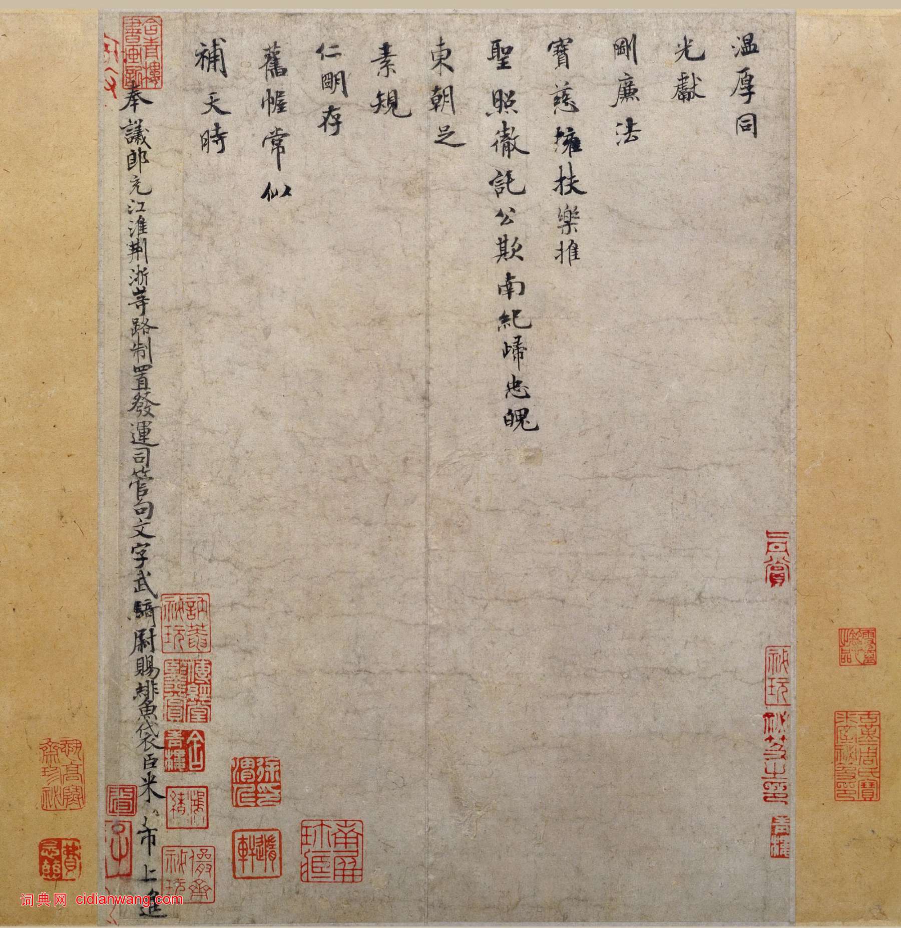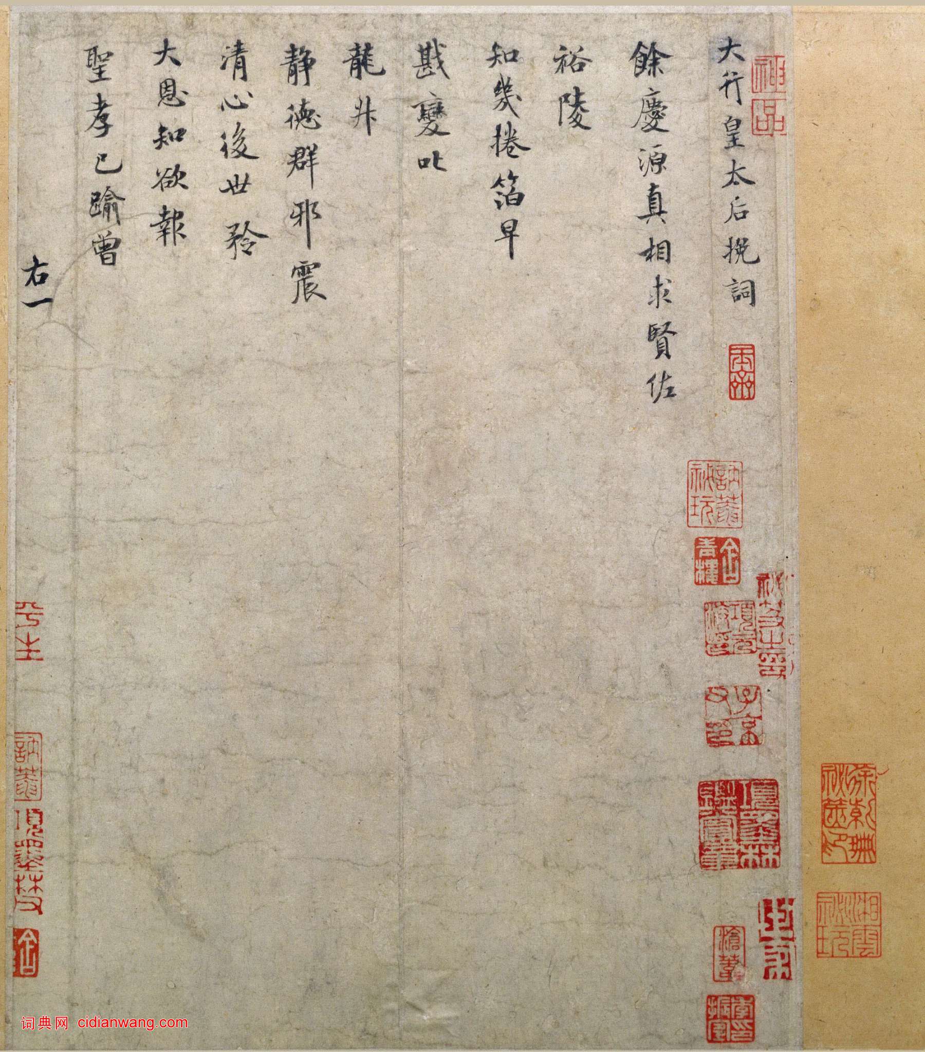 【釋文】大行皇太后輓詞。餘慶源真相,求賢佐裕陵。知幾卷箔早,戡變叱龍升。靜德群邪震,清心後世矜。大恩知欲報,聖孝已逾曾。右一。溫厚同光獻,剛廉法寶慈。擁扶樂推聖,照徹托公欺。南紀歸忠魂,東朝足素規。仁明存舊幄,常似補天時。奉議郎充江淮荊浙等路制置發運司管勾文字武騎尉賜緋魚袋臣米芾上進。