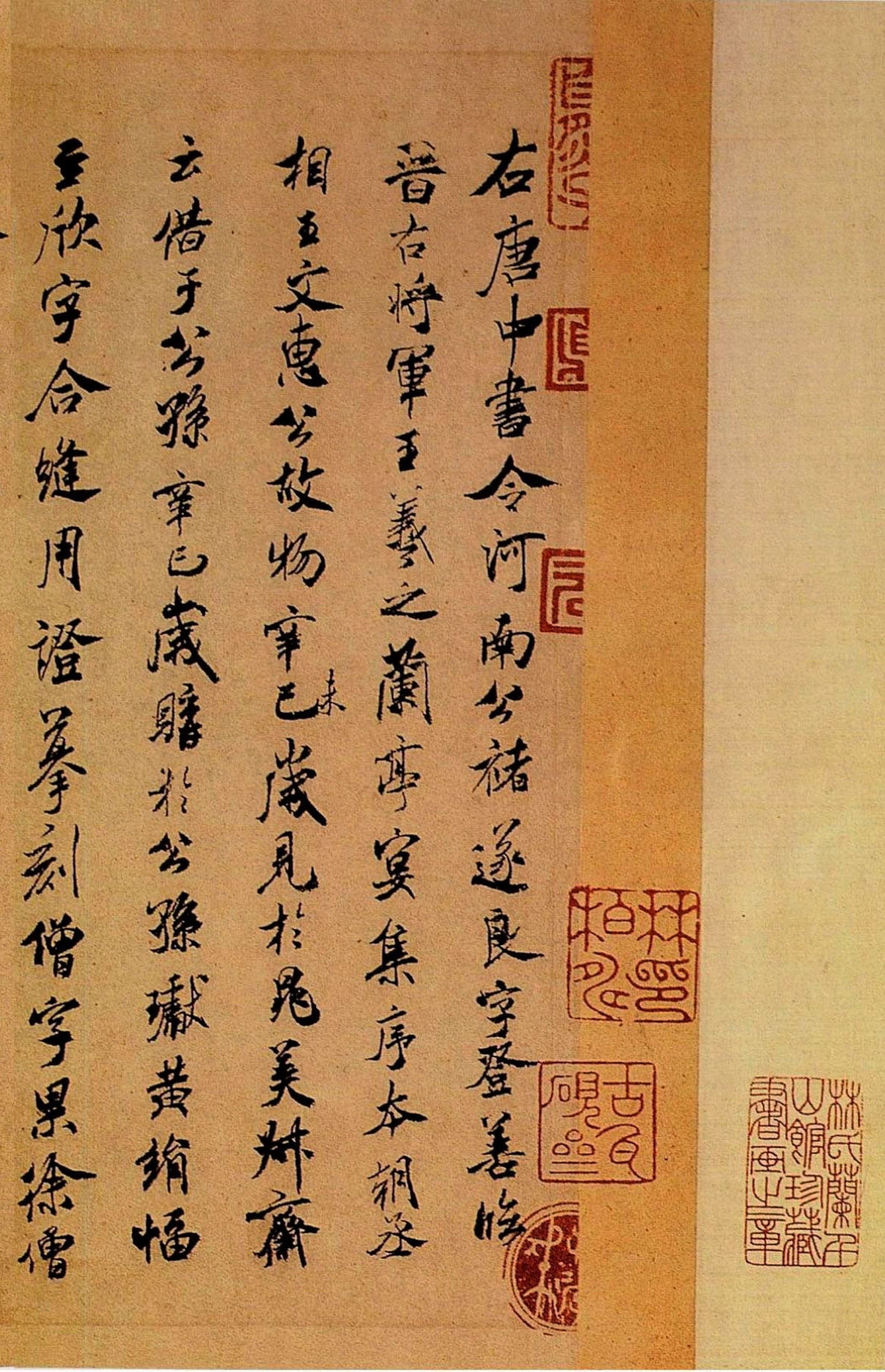 【釋文】右唐中書令河南公褚遂良字登善臨晉右將軍王羲之蘭亭宴集序,本朝丞相王文惠公故物。辛未歲見於晁美叔齋,雲借於公孫。辛巳歲購於公孫巘。黃絹幅至“欣”字合縫,用證摹刻僧字,果徐僧權合縫書也。雖臨王書,全是褚法。其狀若岧岧奇峰之峻,英英穠秀之華,翩翩自得,如飛舉之仙。爽爽孤騫,類逸群之鶴。蕙若振和風之麗,霧露擢隊乾之鮮。蕭蕭慶雲之映霄,矯矯龍章之動彩。九奏萬舞,鵷鷺充庭。鏘玉鳴璫,窈窕合度。宜其拜章帝所,留賞群仙也。至於永和字合其雅韻,九觴字備著其真標,浪字無異於書名,由字益彰其楷則。若夫臨仿莫稱於薛、魏、賞別不聞於歐、虞。信百代之秀規,一時之清鑒也。壬午八月廿六日,寶晉齋舫手裝。
