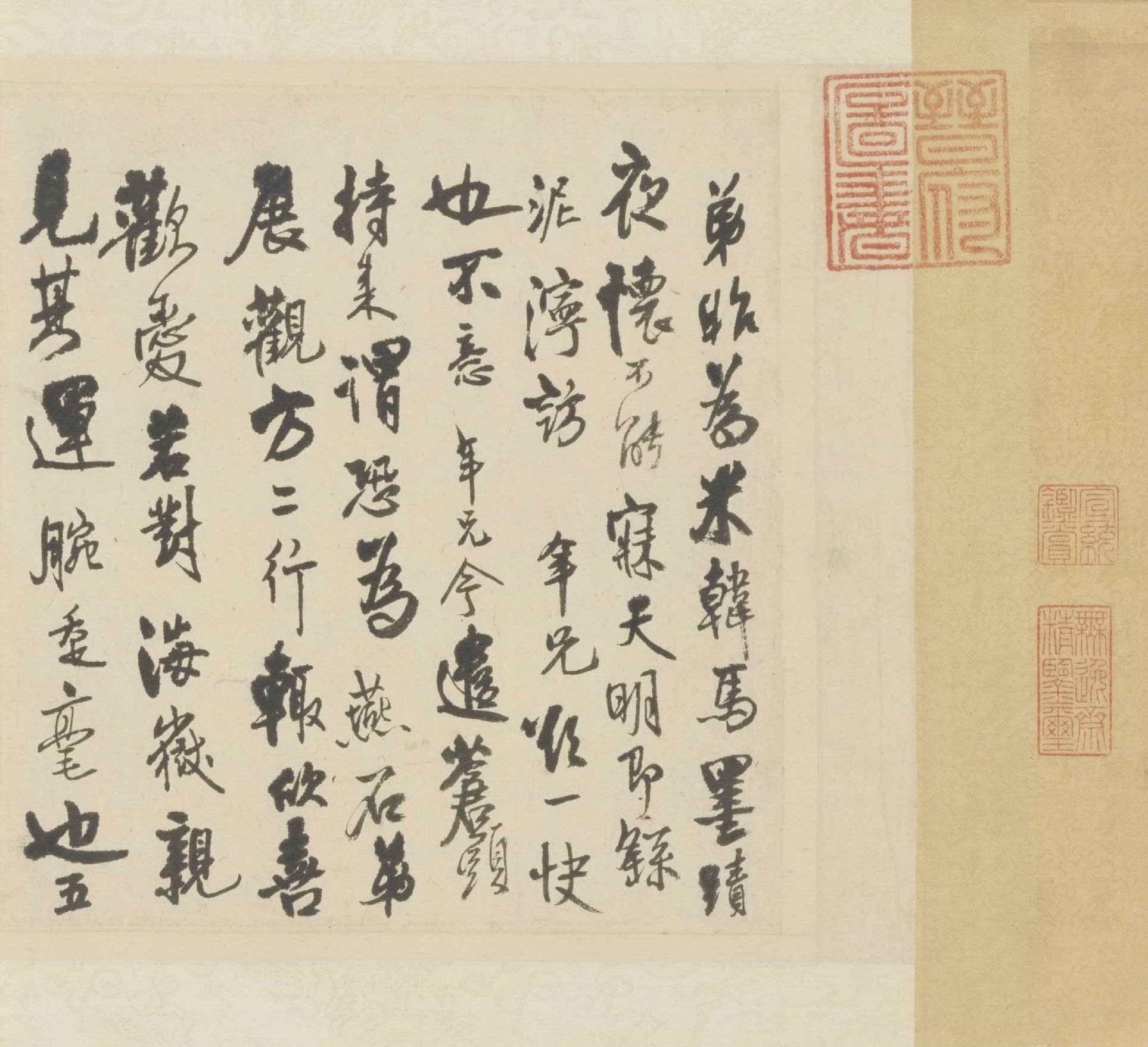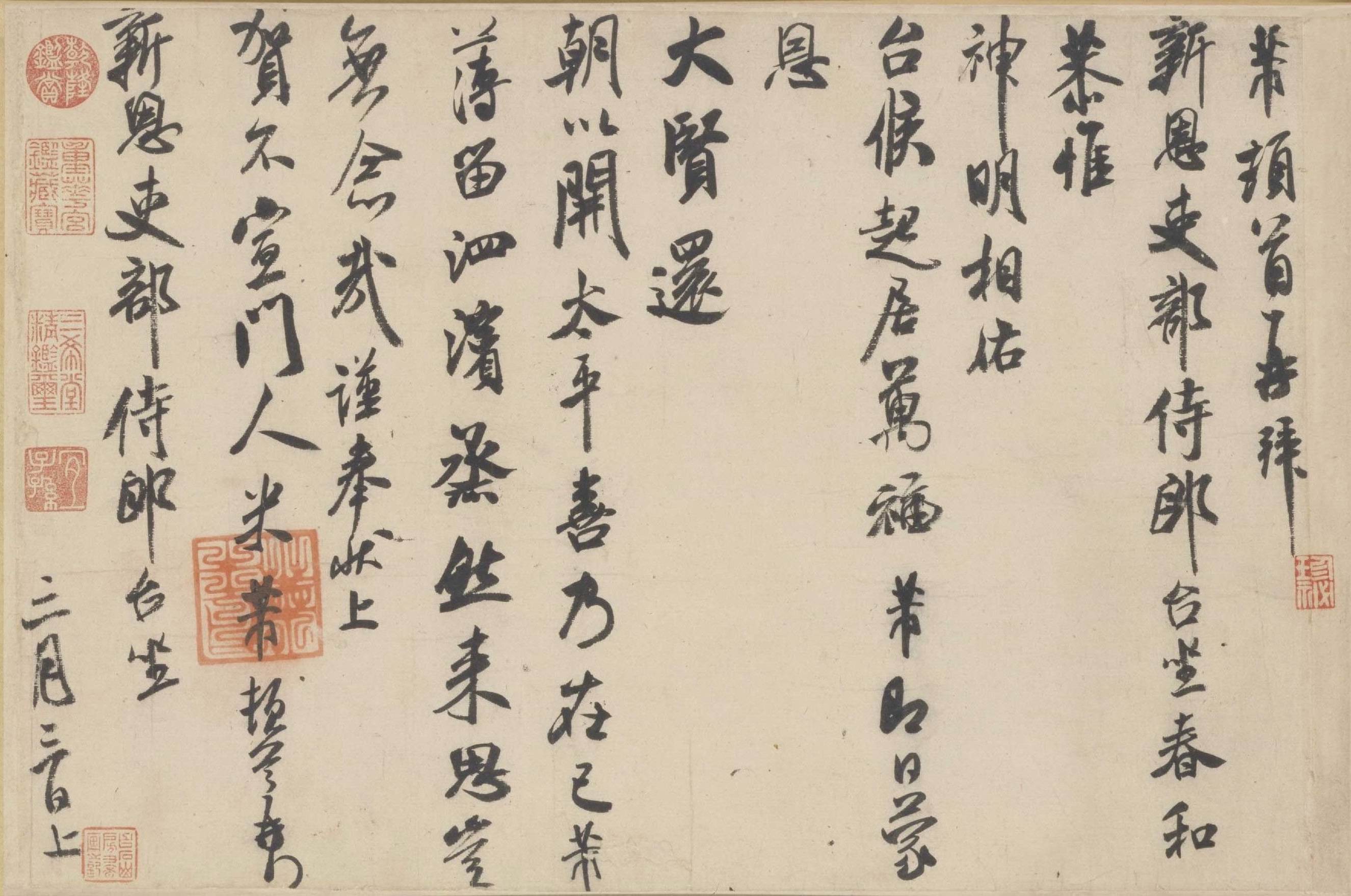 資源下載魏晉書法唐朝書法宋朝書法元朝書法明朝書法清朝書法近現代書法字典網>> 歷代書法>> 宋朝>> 米芾·行書三札卷(3)正文 米芾·行書三札卷(3)作者:米芾 書體:行書 首 頁 上一頁 1 2 3 4 下一頁 尾 頁米芾的相關書法作品:米芾·聞張都大宣德尺牘 米芾草書《元日帖》 米芾《米南宮十七帖》 米芾《伯充帖》 米芾·戲成詩帖 米芾·虹縣詩 米芾·提刑殿院帖 米芾行書《天馬賦》版本二 米芾行書《千字文》集字 相關文章:王寵行草《名山時訪道五言詩》扇面 (行草)王寵《名山時訪道五言詩》扇面 紙本(金箋) 行草書 17.8 × 49.6 c...唐寅行書《雨花台感昔詩札》 (行書)唐寅《雨花台感昔詩札》 紙本 行書 27.5×31cm 北京故宮博物院藏 ...斷臂人張文佑書法欣賞 (行書)張文佑,字德輔,號月台經生。1970年生,河南襄城人,中國書法家協會會員。張文佑...李邕行書《久別帖》 (行書)李邕行書 書法欣賞《久別帖》(宋拓)釋文:“久別,懷仰增深,即日奉。惟動靜安勝。...柳公權楷書《高元裕神道碑》 (楷書)柳公權《高元裕神道碑》 楷書 大中7年(853) 10月全稱“大唐故吏部尚書贈尚...徐鉉·私誠帖 (行書)【釋文】鉉今有私誠。特茲拜託。為先有袪承人劉氏。其骨肉元在貴藩醴陵門裡居住。所有...全國第一屆書法篆刻展作品集-行書部分1980年5月,全國第一屆書法篆刻展覽(國展)在瀋陽展出,現與大家分享由人民美術...書法創作必備琴心聯語108對《琴心聯語》一、虛窗得月閑沽酒,琴室有蘭漫改詩。二、千山鱗甲松風勁,一曲陽春曲韻...趙孟頫《秋深帖》 (行書)《秋深帖》,元,管道昇(趙孟頫)書,紙本,冊頁,縱26.9cm,橫53.3cm,...莫是龍·跋柳公權《蘭亭詩》 (行書)莫是龍跋柳公權《蘭亭詩》,北京故宮博物院藏。