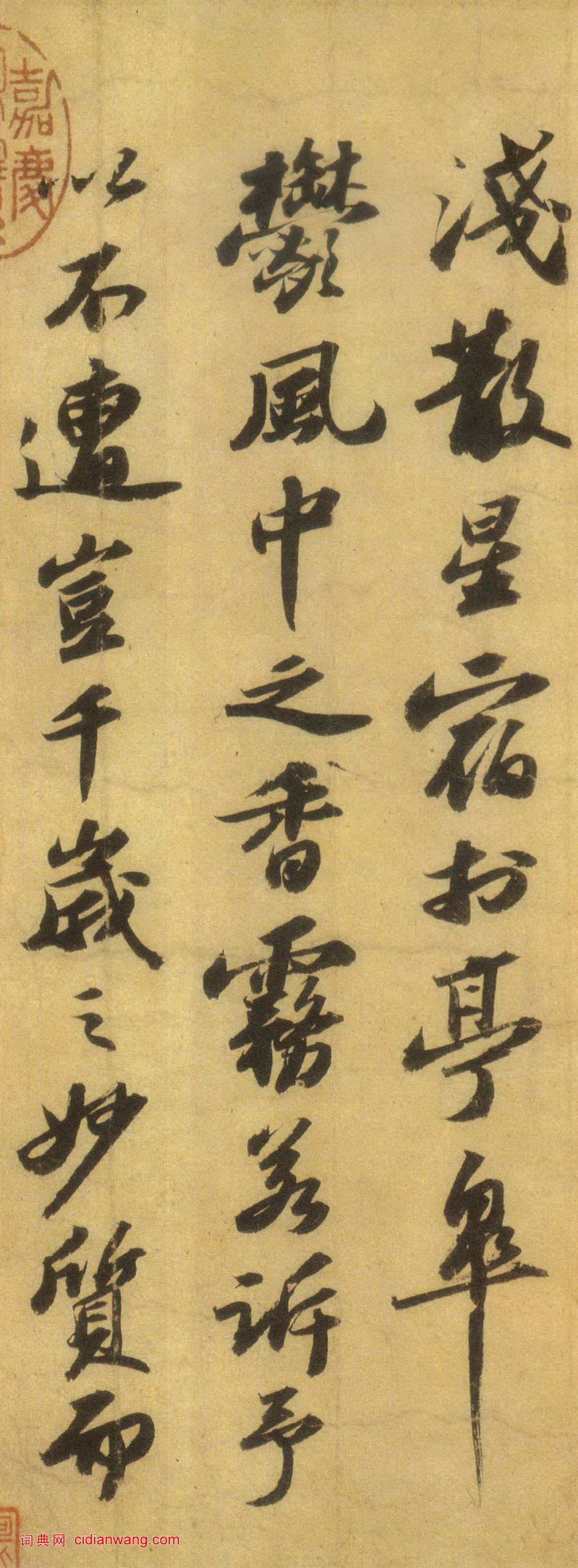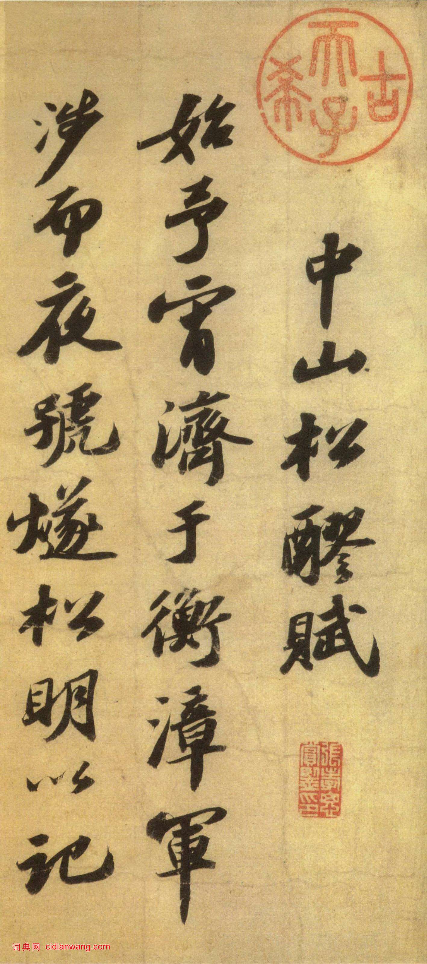 始安定郡王以黃柑釀酒,名之曰“洞庭春色”。其猶子德麟得之以餉予,戲為作賦。後予為中山守,以松節釀酒,復 以賦之。以其事同而文類,故錄為一卷。紹聖元年閏四月廿一日,將適嶺表,遇大雨,留襄邑書此。東坡居士記