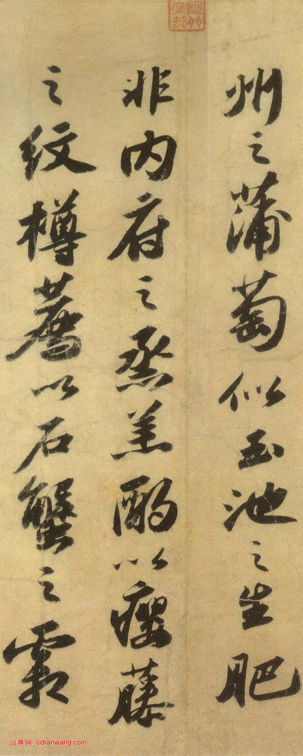 書法欣賞魏晉書法唐朝書法宋朝書法元朝書法明朝書法清朝書法近現代書法字典網>> 歷代書法>> 宋朝>> 蘇軾·洞庭春色賦中山松醪賦合卷(10)正文 蘇軾·洞庭春色賦中山松醪賦合卷(10)作者:蘇軾 書體:行書 首 頁 上一頁 5 6 7 8 9 10 11 12 13 14 下一頁 尾 頁 全文2016-1-15 12:43:40 蘇軾的相關書法作品:蘇軾《人來得書帖》 蘇軾行書《次韻前篇》 蘇軾行書《書杜工部榿木詩卷帖》 蘇軾行書《李白仙詩卷》 蘇軾·洞庭春色賦中山松醪賦合卷 蘇軾行書《近人帖》 蘇軾行書《題王詵詩帖》 蘇軾·跋吏部陳公詩帖 蘇軾行書《東武帖》 相關文章:西周《哀盤》 (篆體)西周《哀盤》釋文:待更新(歡迎留言補充)吳雯《行書過河上道院五言詩軸》 (行書)吳雯《行書過河上道院五言詩軸》紙本行書 149.2×46.6cm 湖南省博物館...王獻之行書《餘杭帖》 (行書)王獻之《餘杭帖》(又稱《觸事帖》)拓本。行書。六行,五十一字。入刻《淳化閣帖》卷...王鐸《擬山園帖》第五卷 (楷書)王鐸《擬山園帖》,共十卷,清代個人叢帖。清順治八年至十六年(公元1651-165...蔡襄楷書《謝賜御書詩表》 (楷書)楷書《謝賜御書詩表》 1053年 卷 紙本 29.3cm X241.5cm 日...于右任行書《黃山谷詩句立軸》 (行書)于右任行書立軸,錄自黃庭堅七言詩《戲贈家安國》 129x30cm 北京海王村畫廊...黃姬水《草書五言律詩扇面》 (草書)黃姬水《草書五言律詩扇面》紙本草書 15.5×46.8cm 台北故宮博物院藏釋...康里巎巎行書《自作秋夜感懷七言古詩》 (行書)康里巎巎《自作秋夜感懷七言古詩》 紙本 28.9×82.2cm 至正四年(1...米芾行書《李太師帖》 (行書)李太師帖 元祐二年(1087年) 紙本 縱25.8厘米 橫31.3厘米 日本東京...文徵明行書《自書五言詩扇》 (行書)文徵明《行書自書五言詩扇》金箋行書 19.1×55cm 北京故宮博物院藏釋文:...