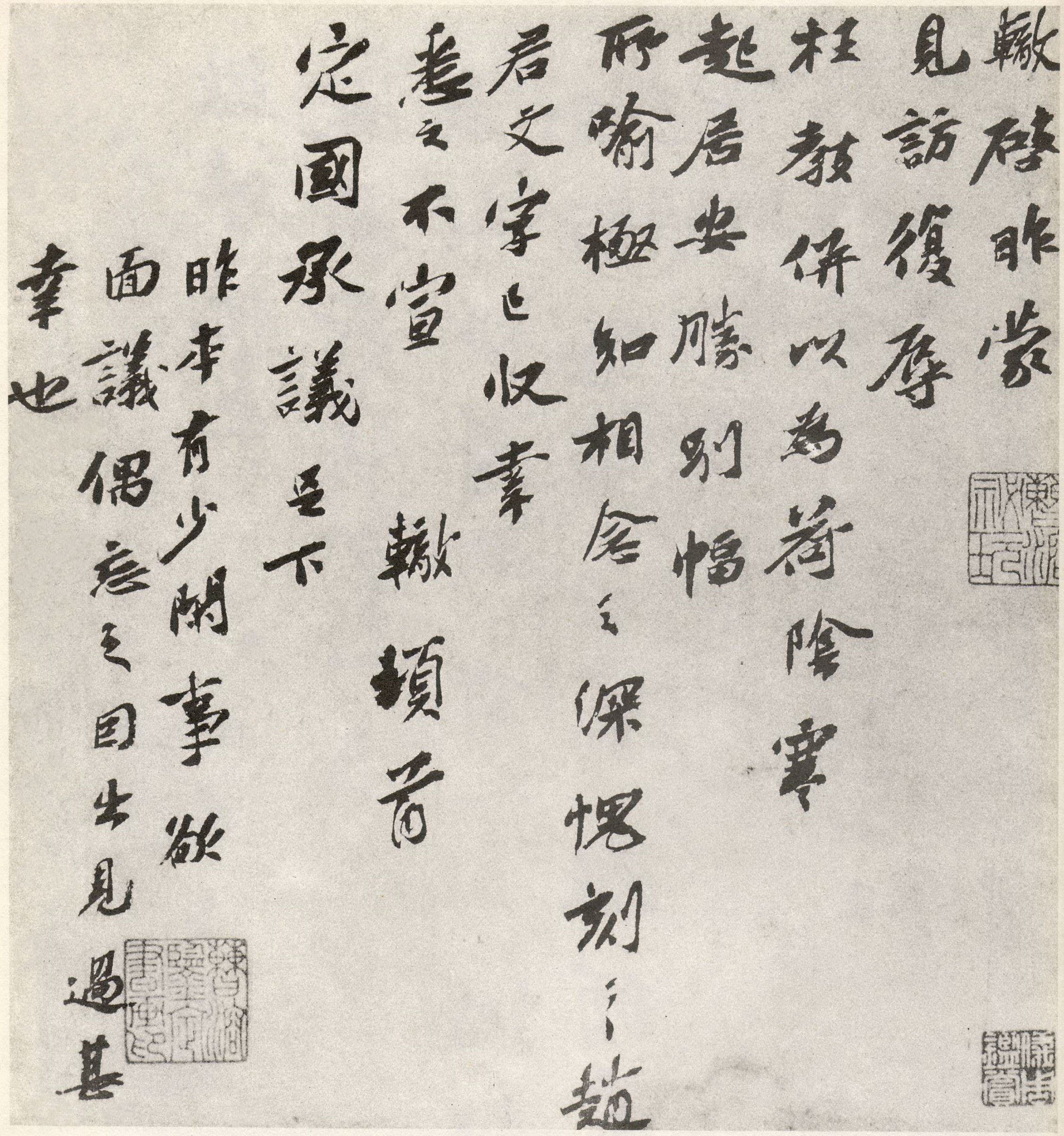 書法欣賞魏晉書法唐朝書法宋朝書法元朝書法明朝書法清朝書法近現代書法字典網>> 歷代書法>> 宋朝>> 蘇轍《見訪帖》正文 蘇轍《見訪帖》作者:蘇轍 書體:行書 蘇轍《見訪帖》,1089年(元祐四年),行書,25.2×24.2cm。台北故宮博物院藏。蘇轍的相關書法作品:蘇轍《懷素自敘帖題跋》 蘇轍《見訪帖》 蘇轍·超然台賦 蘇轍《春寒帖》 蘇轍《晴暖帖》 蘇轍《晚來帖》 相關文章:黃庭堅行書《李公麟五馬圖題記跋語》 (行書)黃庭堅《李公麟"五馬圖"題記跋語》(珂羅版)北京故宮博物院藏宋代傳世名作《五馬圖...劉炳森楷書《千字文》 (楷書)剛接觸書法時,劉炳森先生已經在全國非常火,但是聽到最多的話是“你看你寫的字,跟劉...東漢《王平君闕銘》 (隸書)東漢 王平君闕銘 闕高220cm 寬57cm 四川成都市出土阮元·《石畫記》底稿 (行書)阮元《石畫記》底稿,紙本,大小不一。阮元在任雲、貴總督時,曾在許多具有天然圖畫的...新莽《嘉量》殘片篆書拓本 (篆書)新莽嘉量是王莽建立新朝托古改制舉措的產物之一。新(王莽)始建國元年(9)頒行的標...倪元璐《行草書題小桃源圖詩軸》 (行草)倪元璐《行草書題小桃源圖詩軸》 絹本行草書,133.7×41.9cm。北京故宮...沈曾植《節錄文心雕龍史傳篇文軸》 (行草)沈曾植《節錄文心雕龍史傳篇文軸》紙本行草書 146.7×79.5cm 浙江省博...袁枚《致西崖書札》 (行書)【釋文】袁枚頓首。西崖老先生閣下:枚燈節後作九峰、三泖之游,兩月還山、見案上有閣...東漢隸書《韓仁銘碑》 (隸書)《韓仁銘》 篆書碑額:漢循吏故聞熹長韓仁銘東漢隸書碑刻。 石碑篆額題《漢循吏故聞...林散之《草書自作詩軸》 (草書)林散之《草書自作詩軸》紙本草書 96×34cm 1977年 馬鞍山林散之藝術館...