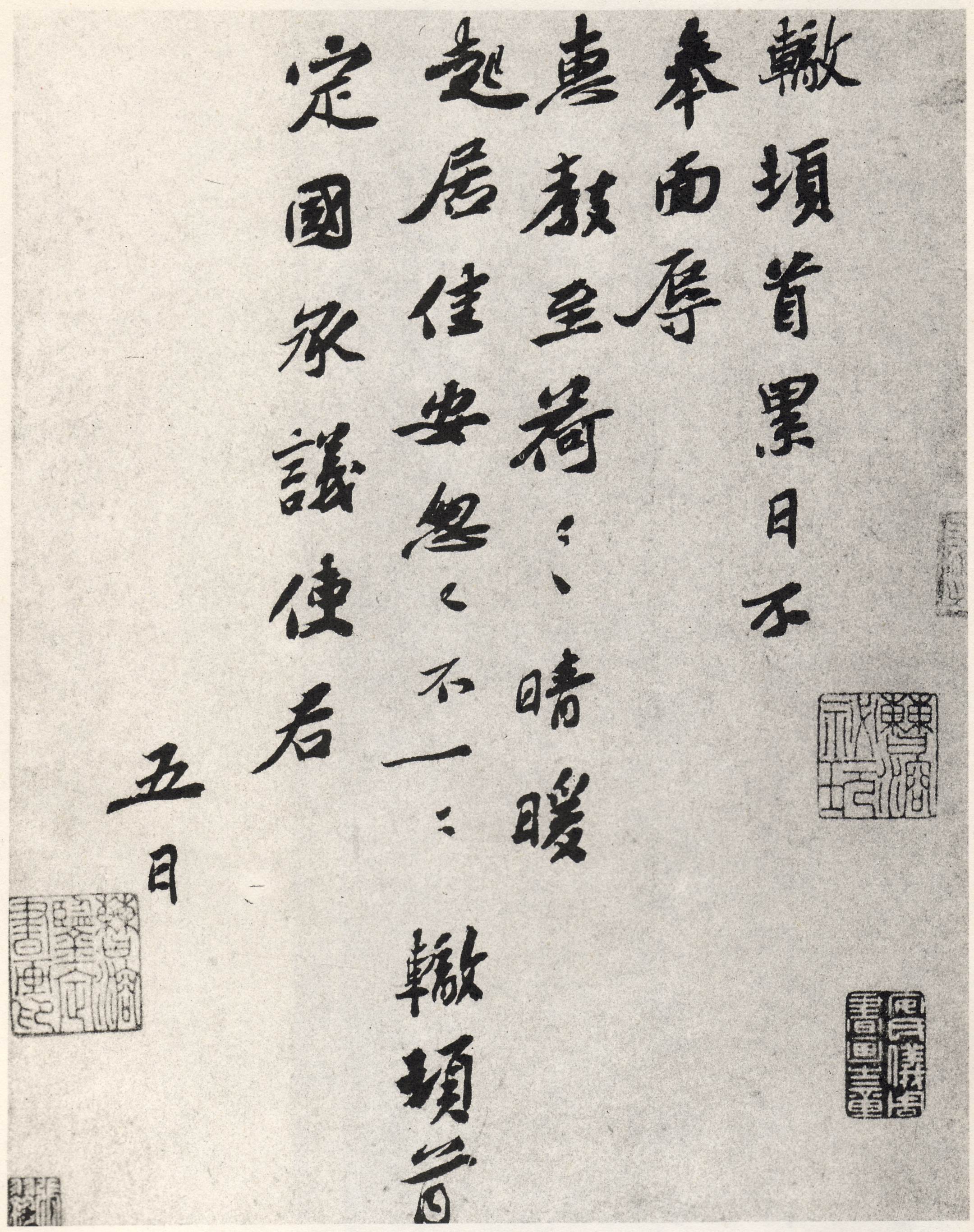 書法欣賞魏晉書法唐朝書法宋朝書法元朝書法明朝書法清朝書法近現代書法字典網>> 歷代書法>> 宋朝>> 蘇轍《晴暖帖》正文 蘇轍《晴暖帖》作者:蘇轍 書體:行書 蘇轍《晴暖帖》,1089年(元祐四年),行書,紙本,24.9×19.8厘米,台北故宮博物院藏。釋文:轍頓首。累日不奉面,辱惠教至荷荷。晴暖起居佳安。忽忽不一一。轍頓首。定國承議使君,五日。蘇轍的相關書法作品:蘇轍《見訪帖》 蘇轍《懷素自敘帖題跋》 蘇轍《春寒帖》 蘇轍《晴暖帖》 蘇轍《晚來帖》 蘇轍·超然台賦 相關文章:李廷相·跋《神龍蘭亭序》 (行書)李廷相跋《神龍蘭亭序》,縱24.5cm,北京故宮博物院藏。張伯英《行楷散此偶有八言聯》 (行楷)張伯英《行楷“散此偶有”八言聯》 刊於《書法》2011年第7期 ...文徵明行書自作詩卷 (行書)釋文: 三年端笏侍明光,潦倒爭看白髮郎。 咫尺常瞻天北極,分番曾直殿東廊。 紫泥...朱熹草書《秋深帖》 (草書)宋 朱熹《秋深帖》(致會之知郡朝議尺牘) 台北故宮博物院藏(掃描自武夷山朱熹研...王羲之蘭亭序,也有“瑕疵”馮承素摹王羲之《蘭亭序》書法家:王羲之《蘭亭序》三個最經典的摹本,分別出自唐代書...吳昌碩《篆書雪廬橫幅》 (篆書)吳昌碩《篆書雪廬橫幅》紙本篆書 34×104cm 1923年 西泠印社藏 釋文...金農《隸書軸 》 (隸書)金農隸書軸 紙本 80×47.5cm 1757年 香港藝術館虛白堂藏 釋...張瑞圖行草《感遼事作六首卷》 (行草)張瑞圖《感遼事作六首卷》 綾本行草書 29×381cm 天啟元年(1621)藏...趙孟頫行書《七絕詩冊》 (行書)趙孟頫《七絕詩冊》,紙本,行書,縱34.7cm,橫35.3cm。 北京故宮博物院...徐三庚《篆書典校敷陳六言聯》 (篆書)徐三庚《篆書典校敷陳六言聯》紙本篆書 102.2×22cm×2 上海博物館藏...
