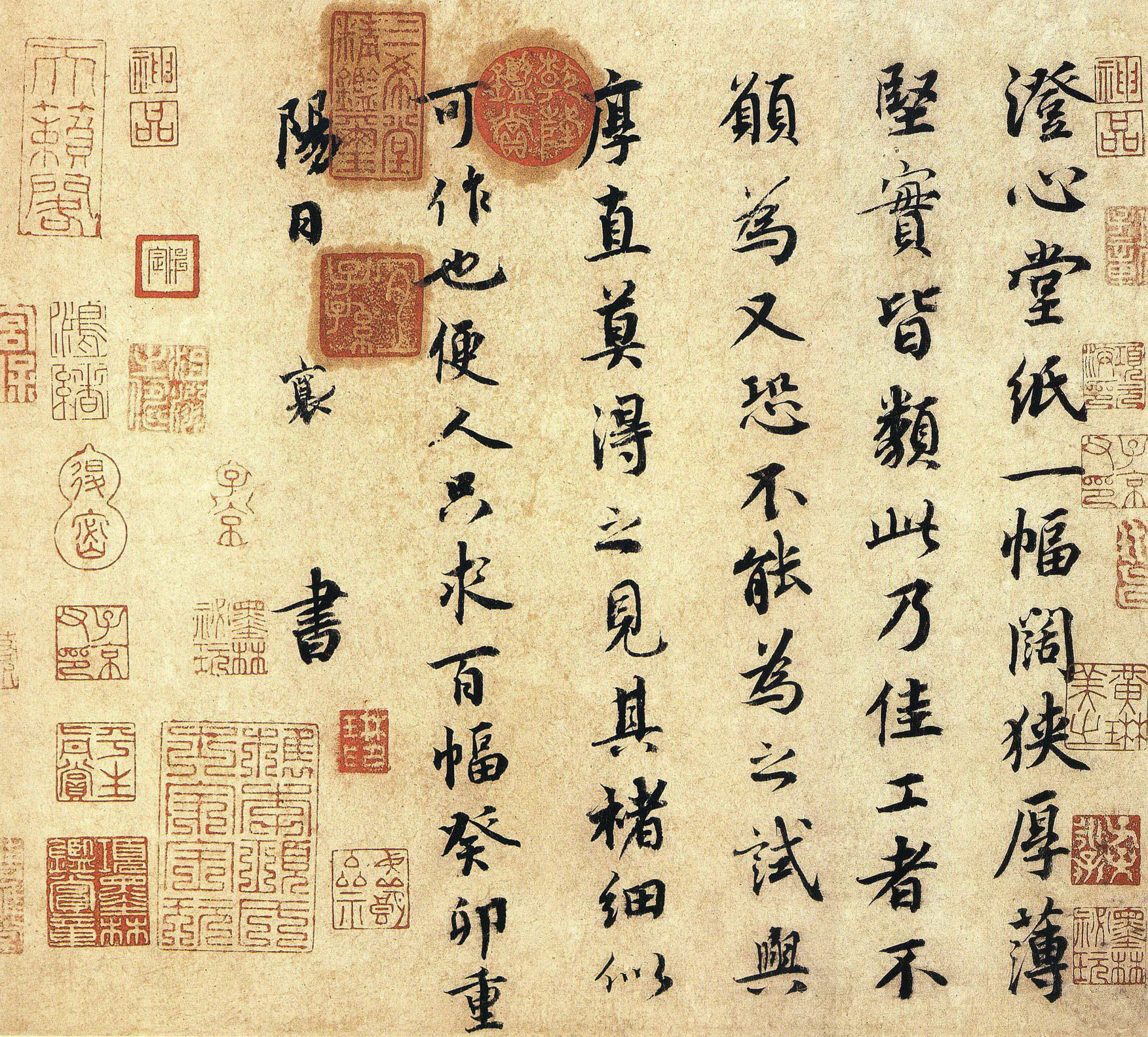 【釋文】澄心堂紙一幅。闊狹厚薄堅實皆類此乃佳。工者不願為。又恐不能為之。試與厚直莫得之。見其楮細似可作也。便人只求百幅。癸卯重陽日。襄書。