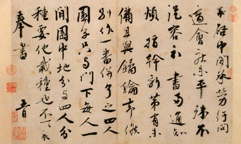 書法欣賞魏晉書法唐朝書法宋朝書法元朝書法明朝書法清朝書法近現代書法字典網>> 歷代書法>> 宋朝>> 蔡襄《紆問帖》正文 蔡襄《紆問帖》作者:蔡襄 書體:行書 蔡襄《紆問帖》,1052年,紙本,縱26.7厘米,橫28.7厘米。台北故宮博物院藏。釋文:“襄啟:中間承勞紆問,適會疾未平,殊不從容,示書兩通,知煩指乾,新第有未備,且與鐍鑰。卻候別作一番倂了之。四人園子,只與門下每人一間,園中地,分與四人分種,要他載重也。不一一。襄奉書。五日。”高清大圖下一頁:1 2 下一頁 尾 頁蔡襄的相關書法作品:蔡襄《入春帖》 蔡襄行楷《虛堂詩帖》 蔡襄《陶生帖》 蔡襄的書法,被蘇軾推為第一 ! 蔡襄的書法大全 蔡襄《持書帖》 蔡襄《蒙惠帖》 蔡襄·門屏帖 蔡襄楷書《謝賜御書詩表》 相關文章:釋擔當《草書七絕詩軸》 (草書)釋擔當《草書七絕詩軸》紙本草書釋文:村遠人疏路又歧,怯寒全在小春時。不知煙柳緣何...米芾草書《吾友帖》 (草書)米芾《吾友帖》(草書九帖之四) 紙本 草書,縱25.2厘米 橫39厘米 日本大阪...金農漆書古謠一首 (隸書)漆書古謠一首 1757年作 紙本 縱58.5厘米 橫24.5厘米 廣東省博物館藏...王羲之《蘭亭序》 (行書)神龍本(馮承素摹本)【釋文】永和九年,歲在癸丑,暮春之初,會於會稽山陰之蘭亭,修...吳昌碩《隸書村里家中五言聯》 (隸書)吳昌碩《隸書村里家中五言聯》紙本隸書 127.9×33.5cm×2 1924...王福庵篆書《說文部目》 (篆書)王福庵書穴說文部目鑼五百四十字篆書一冊,為西泠印社所藏,解放前曾影印出版。一九七...顏真卿行草《裴將軍詩》 (行草)浙江省博物館藏宋拓忠義堂法帖:顏真卿行草書《裴將軍詩》 ,又稱《送裴將軍北伐詩卷...傅山《草書七絕詩屏》軸 (草書)傅山《草書七絕詩屏》軸 綾本 198.7×46.8×4,上海博物館藏。 傅山...顏真卿楷書《大唐中興頌》 (楷書)《大唐中興頌》,唐元結撰,顏真卿書,唐摩崖刻石,宋拓,麻紙,黑墨精拓,裝裱成冊,...張羽行書《懷胡參政頁》 (行書)張羽《懷胡參政頁》紙本行書 17.1×6.5cm 北京故宮博物院藏釋文:懷胡參...