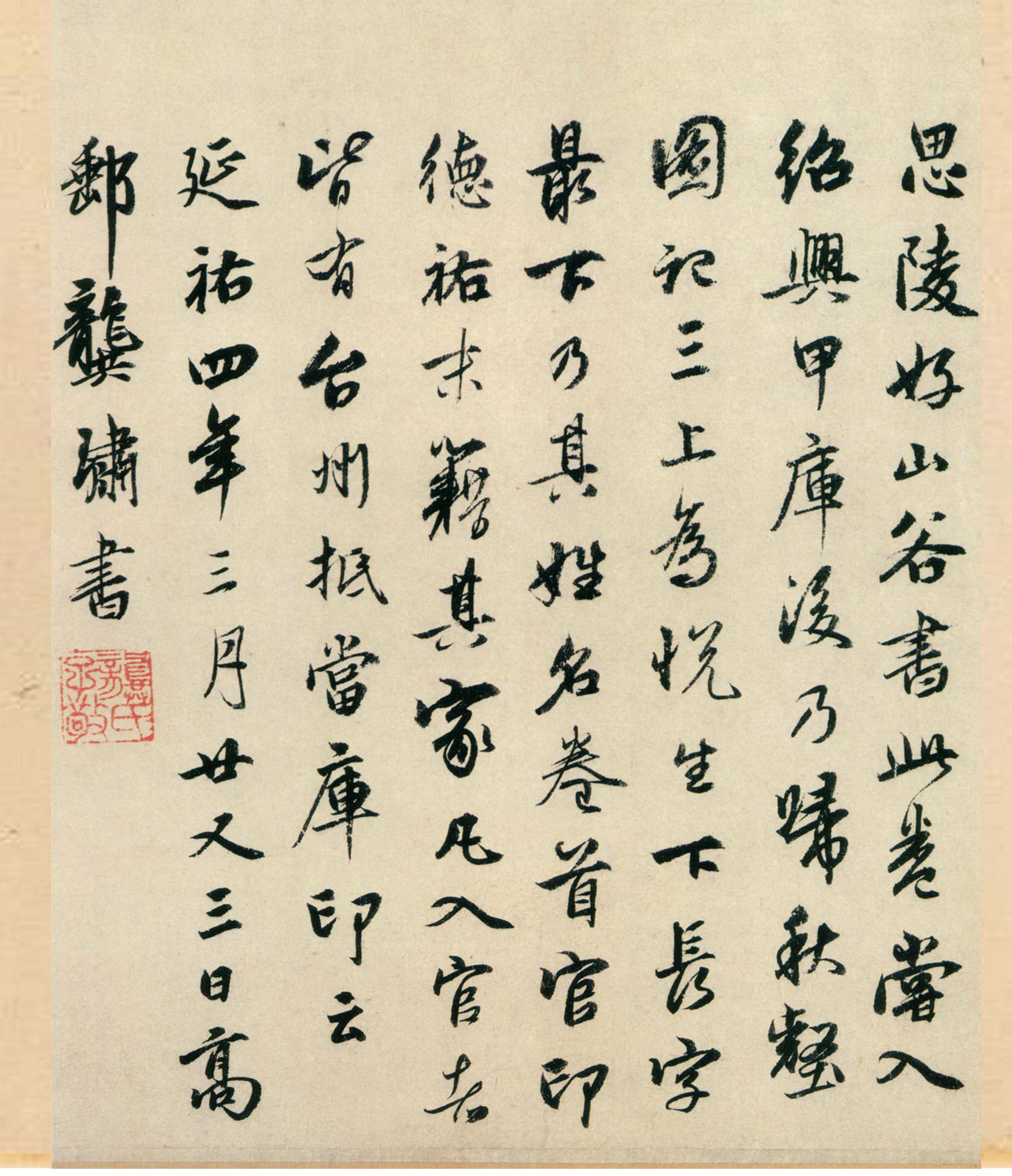 書法欣賞魏晉書法唐朝書法宋朝書法元朝書法明朝書法清朝書法近現代書法字典網>> 歷代書法>> 宋朝>> 黃庭堅《龐居士寒山子詩》(4)正文 黃庭堅《龐居士寒山子詩》(4)作者:黃庭堅 書體:行書 【跋釋文】思陵好山谷書。此卷嘗入紹興甲庫。後乃歸秋壑。圖記三。上為悅生。下長字。最下乃其姓名。卷首官印。德祐末。籍其家。凡入官者。皆有台州抵當庫印雲。延祐四年(1317年)三月廿又三日。高郵龔璛書。首 頁 上一頁 1 2 3 4黃庭堅的相關書法作品:黃庭堅行書《齊君帖》 黃庭堅小楷《跋范仲淹“道服贊”》 黃庭堅行書《雪寒帖》 黃庭堅草書《公以道安帖》 黃庭堅行書《酺池寺詩》 黃庭堅大字楷書《牛口莊題名卷》 黃庭堅行書《致景道十七使君詩》 黃庭堅《行書華嚴經疏卷》 黃庭堅《龐居士寒山子詩》 相關文章:篆刻“六補”是什麼意思【導讀】作為藝術的構成因素章法、字法、筆法和刀法不是那么能機械的分開的,往往是相...浙東第一碑《漢三老諱字忌日碑》 (篆隸)西泠印社漢三老石室中的《漢三老諱字忌日碑》,是浙東第一古碑,三老碑立於公元223...王寵草書《自書五憶歌》 (草書)王寵《自書五憶歌》 紙本 草書 29.3×294.7厘米。台北故宮博物院藏。 ...呂大防《示問帖》 (行楷)呂大防《示問帖》,紙本,行楷書,縱27.4厘米,橫44.5厘米。《示問帖》是呂大...倪瓚楷書《跋陸繼善摹禊帖》 (楷書)倪瓚《跋陸繼善摹禊帖》 1342年,縱:24.7cm, 台北故宮博物院藏釋文:蘭...楊維楨·草書題錢譜 (草書)【釋文】華亭姚澤持一縹綠冊。再拜晉於鐵先生曰。此澤平日好古博雅之功。曰古泉譜也。...東漢篆書碑刻《袁安碑》 (篆書)《袁安碑》東漢篆書碑刻。全稱《漢司徒袁安碑》。東漢永元四年立。在今河南境內,碑石...梁漱溟行書《守之以道行其所知四言聯》 (行書)梁漱溟《守之以道行其所知四言聯》行書 1980年釋文:守之以道,行其所知。 ...蘇遲·跋懷素《自敘帖》 (行書)蘇遲跋懷素《自敘帖》,藏台灣故宮博物院。李懷琳·嵇康與山巨源絕交書 (草書)釋文康白:足下昔稱吾於潁川,吾常謂之知言。前年河東還,諸人說足下議欲以吾自代,事...