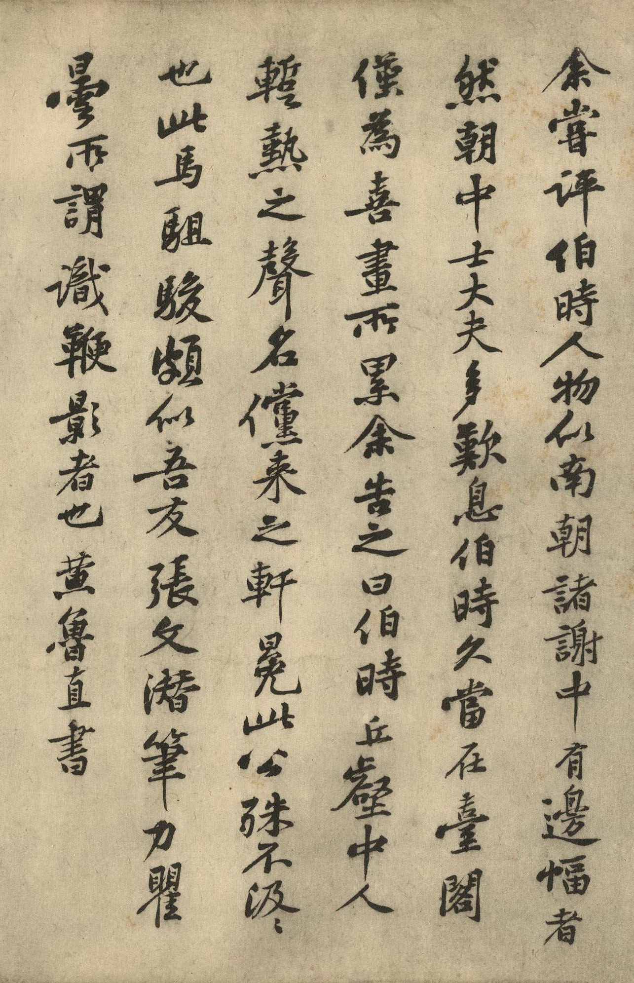 書法欣賞魏晉書法唐朝書法宋朝書法元朝書法明朝書法清朝書法近現代書法字典網>> 歷代書法>> 宋朝>> 黃庭堅·跋李公麟《五馬圖卷》正文 黃庭堅·跋李公麟《五馬圖卷》作者:黃庭堅 書體:行書 黃庭堅跋李公麟《五馬圖卷》,行書。釋文:余嘗評伯時人物似南朝諸謝中有邊幅者。然朝中士大夫多嘆息伯時久當在台閣,僅為喜畫所累。余告之曰:伯時丘壑中人,暫熱之聲名,儻來之軒冕,此公殊不汲汲也。此馬駔駿,頗似吾友張文潛筆力。瞿曇所謂識鞭影者也。黃魯直書。黃庭堅的相關書法作品:黃庭堅行楷《送四十九侄詩》 黃庭堅·跋李公麟《五馬圖卷》 黃庭堅楷書《徐純中墓志銘》 黃庭堅草書《書杜甫寄賀蘭銛詩》 黃庭堅小楷《跋范仲淹“道服贊”》 黃庭堅行書《致雲夫七弟尺牘》 黃庭堅·惟清道人帖 黃庭堅草書《花氣薰人帖》 黃庭堅行書《王史二氏墓志銘稿卷》 相關文章:米芾行書《自敘帖》 (行書)米芾《自敘帖》宋拓本(局部) 北京故宮博物院藏 米芾《自敘帖》...莫友芝《篆書江湖草木七言聯》 (篆書)莫友芝《篆書江湖草木七言聯》 紙本篆書 159×26.5cm×2 貴州省博物...趙孟頫《行草陶淵明五言詩頁》 (行草)趙孟頫《行草陶淵明五言詩頁》 縱32.7厘米 橫45.8厘米 北京故宮博物院藏書...趙佶楷書《閏中秋月詩帖》 (楷書)宋 趙佶《閏中秋月詩帖》紙本 楷書 35×44.5cm 北京故宮博物院藏這件...趙孟頫行書《文賦》 (行書)《文賦》為墨跡本,是初唐時期少有的幾部名家真跡之一。據《石渠寶笈》載,縱26.6...趙孟頫草書《種松帖》 (草書)《種松帖》是他寫給老家的書信,信中提及自己顧念家鄉之事,但心有餘而力不足,難以事...長沙窯詩文壺《古今車馬不謝》 (行書)行書——青釉褐彩“古今車馬不謝”題記壺 高17.8厘米 口徑9.4厘米 底徑9...王羲之行書《孔侍中帖》 (行書)王羲之《孔侍中帖》摹本, 紙本。縱26.9厘米。6行,42字。行書。釋文:九月十...何紹基行書《蕉鹿蓴鱸七言聯》 (行書)何紹基《行書“蕉鹿蓴鱸”七言聯》紙本蠟箋行書 124.5×30.5cm×2...蘇軾行書《令子帖》 (行書)蘇軾《令子帖》 書於紹元年(1094)。紙本。行書,尺牘一則。凡4行,計50字。...