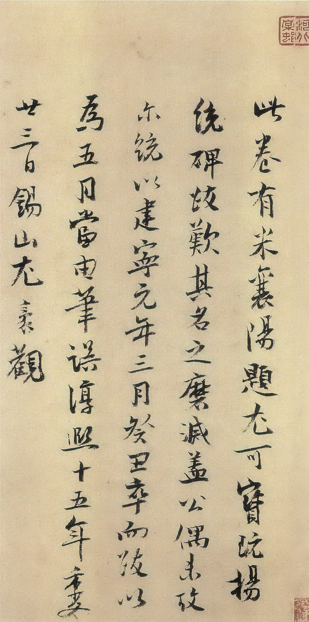 書法欣賞魏晉書法唐朝書法宋朝書法元朝書法明朝書法清朝書法近現代書法字典網>> 歷代書法>> 宋朝>> 尤袤·跋歐陽修《集古錄跋》正文 尤袤·跋歐陽修《集古錄跋》作者:尤袤 書體:行書 【釋文】卷有米襄陽題。尤可寶玩。楊統碑跋。歎其名之磨滅。蓋公偶未考尒。統以建寧元年(168)三月癸丑卒。而跋以為五月。當由筆誤。淳熙十五年(1188)季冬廿三日。錫山尤袤觀。尤袤跋歐陽修《集古錄跋》,台北故宮博物院藏。尤袤的相關書法作品:尤袤·跋歐陽修《集古錄跋》 尤袤·跋范仲淹《師魯帖》 尤袤·跋李結《西塞漁舍圖》 相關文章:康有為《行書五言聯》 (行書)康有為《行書五言聯》 紙本 縱171厘米 橫45.1厘米 上海博物館藏資料來自上...趙之謙《篆書潛夫論四條屏》 (篆書)趙之謙《篆書潛夫論四條屏》泥金箋本篆書 173.5×71cm×4 1872年...祝允明·劉君文威聽泉記 (行書)【釋文】《劉君文威聽泉記》。聽泉之旨,在文威其詞。問及仆,大率推演物性,規擬人品...毛奇齡《行書贈劉考功主文八閩之作七律詩軸》 (行書)毛奇齡《行書贈劉考功主文八閩之作七律詩軸》綾本 行書 161×45.8cm 天...唐國詮小楷《善見律》 (小楷)唐 國詮小楷《善見律》烏絲欄紙本,275行,行17字 縱22.6厘米 橫468....乾隆御筆《斗鹿賦》 (行書)乾隆在《斗鹿賦》中體現出三個重要的文學價值:一是體現出乾隆聖心天眷的仁義之心;二...王文治行書《致嘯崖書札》 (行書)王文治字禹卿,號夢樓。江蘇丹徒(今江蘇省鎮江市)人。十二歲便吟詩作書,詩有唐人風...米芾·虹縣詩 (行書)【釋文】虹縣舊題雲。快霽一天清淑氣,健帆千里碧榆風。滿舡書畫同明月,十日陏花窈窕...陳方行書《致茂實省元契兄尺牘》 (行書)陳方《致茂實省元契兄尺牘》 紙本行書 31.3×39.1cm 台北故宮博物院藏...如何提高書法臨摹的字形準確性提高臨摹的字形準確性基礎知識普及:一、外輪廓法二、重心法三、中宮法四、主筆法五、...