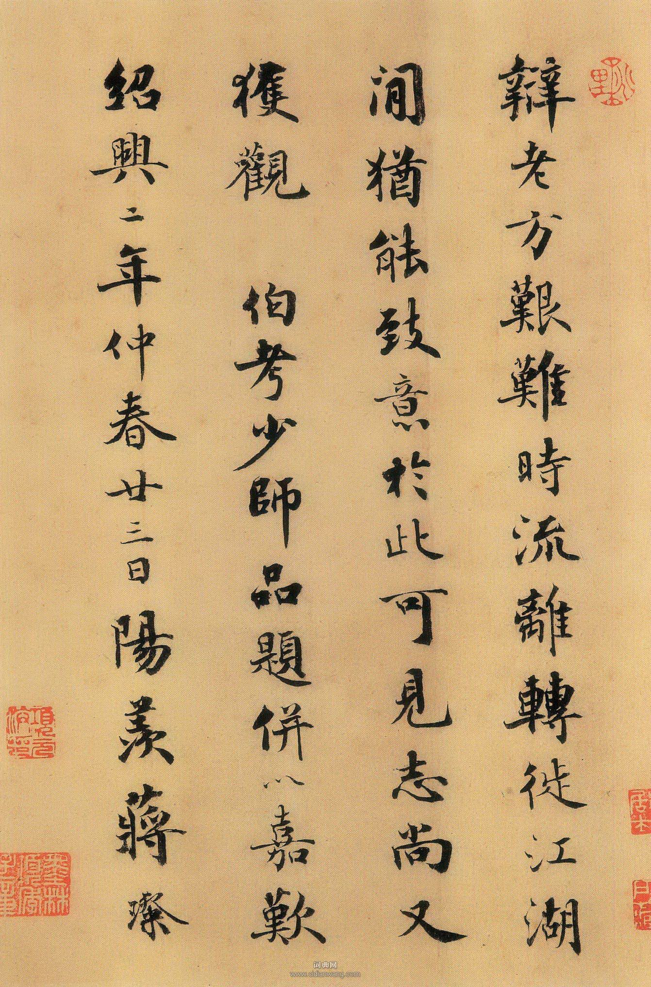 書法欣賞魏晉書法唐朝書法宋朝書法元朝書法明朝書法清朝書法近現代書法字典網>> 歷代書法>> 宋朝>> 蔣璨·跋懷素《自敘帖》正文 蔣璨·跋懷素《自敘帖》作者:蔣璨 書體:行書 【釋文】辯老方艱難時流離轉徙江湖間猶能致意於此可見志尚又獲觀伯考少師品題並以嘉嘆紹興二年仲春三日陽羨蔣璨蔣璨跋懷素《自敘帖》。相關文章:大慧宗杲·尺牘 (行書)大慧宗杲尺牘,紙本,行書,38.0×65.5cm。日本東京國立博物館藏(松平直...徐浩《陳尚仙墓誌》 (楷書)此志文字結體嚴謹、平整,筆畫精到而又舒展有度,與《不空和尚碑》相比,沒有其靈動穩...歐陽詢·小楷黃帝陰符經 (小楷)選自《契蘭堂帖》黃帝陰符經。觀天之道,執天之行,盡矣。天有五賊,見之者昌。五賊在...北魏《孫秋生造像記》 (楷書)孫秋生造像記拓片 《孫秋生造像記》,全稱《孫秋生劉起祖二百人等造像記》,在洛陽龍...馮夢龍楷書《跋顧隱亮像》 (楷書)馮夢龍《跋顧隱亮像》,楷書。南京博物院藏。馮夢龍《跋顧隱亮像》釋文:爾非儒,談諧...周天球行書《心經》 (行書)周天球《心經》 紙本行書 85.3×27.2cm 上海博物館藏釋文:(略) ...宗泐·跋王蒙《太白山圖》 (楷書)宗泐跋王蒙《太白山圖》,楷書,縱27厘米。現藏遼寧博物館。應均行草《紅杏碧桃八言聯》 (行草)應均《紅杏碧桃八言聯》紙本行草書 1936年 浙江永康萬泰美術館釋文:紅杏壓林幽...申時行《行草七律詩扇》 (行草)申時行《行草七律詩扇》 19.4×55cm 蘇州博物館藏釋文: 早學羊裘釣寫春...文徵明大字行書《題宋高宗賜岳飛手敕》 (行書)文徵明書法題跋《宋高宗賜岳飛手敕》,1559年文衡山90歲行書題宋高宗賜岳飛手敕...