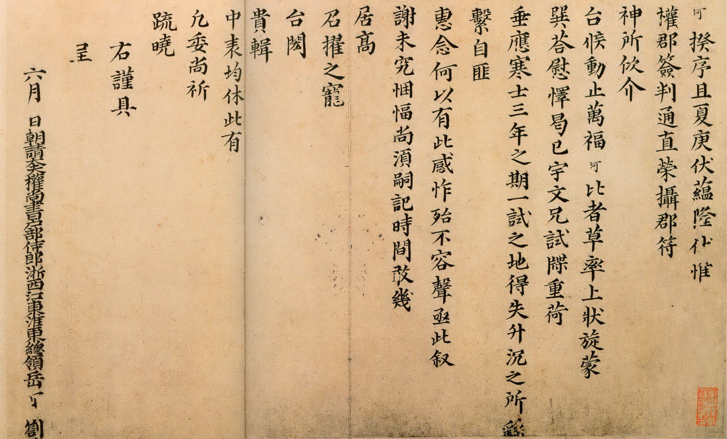 書法欣賞魏晉書法唐朝書法宋朝書法元朝書法明朝書法清朝書法近現代書法字典網>> 歷代書法>> 宋朝>> 岳珂·郡符帖正文 岳珂·郡符帖作者:岳珂 書體:楷書 岳珂《郡符帖》,紙本,楷書,30.3×49.5cm。北京故宮博物院藏。此帖楷書工整,是典型的宋代信札“剳子”格子。鑑藏印記:“岳雪樓主人六孫昭鋆私印”(白文)、“許子仙鑑定印”(朱文)、“許烈之印”(朱文)、“受青”(朱文)。岳珂的相關書法作品:岳珂·郡符帖 岳珂·跋《唐摹王羲之一門書翰卷》 相關文章:貫雲石行書《題宋人寒鴉圖卷》 (行書)貫雲石《題宋人寒鴉圖卷》行書 縱28cm 遼寧省博物館藏 釋文:飢凍哀鳴不忍觀...北魏《馬振拜造像題記》 (楷書)《馬振拜造像題記》,全稱《馬振拜等三十四人為皇帝造像記》,龍門二十品之十二。正書...尤袤·跋范仲淹《師魯帖》 (行書)尤袤跋范仲淹《師魯帖》,行書。尤袤(mào)(1127年—1202年),字延之...柳公權楷書《陸士衡演連珠》 (楷書)柳公權楷書《陸士衡演連珠》拓片,相傳《陸士衡演連珠》只比玄秘塔早寫了六個月。此時...蘇軾行書《跋王晉卿藏挑耳圖帖》 (行書)蘇軾行書題跋《跋王晉卿藏挑耳圖帖》絹本,又名《王齊翰勘書圖跋》,蘇東坡自署書於元...吳寬行書《飲洞庭山悟道泉詩》 (吳寬)吳寬《飲洞庭山悟道泉詩》紙本 140.4×57cm 北京故宮博物院藏。釋文:...文信·野秀軒記 (楷書)文信《野秀軒記》,楷書,香港中文大學文物館藏。文信明洪武初人,號雪山,永嘉人。《敦煌曲子》殘稿 (楷書)《敦煌曲子》殘稿 法國巴黎國家圖書館藏 轉自《敦煌國際項目》IDP資料庫 敦煌曲...翁同龢行書《垂竿翥鶴五言聯》 (行書)翁同龢《行書垂竿翥鶴五言聯》紙本行書 150×39cm×2 常州博物館藏釋文...吳昌碩《篆書樹角花陰八言聯》 (篆書)吳昌碩《篆書樹角花陰八言聯》 191.5×38.5cm×2 1912年 君匋...