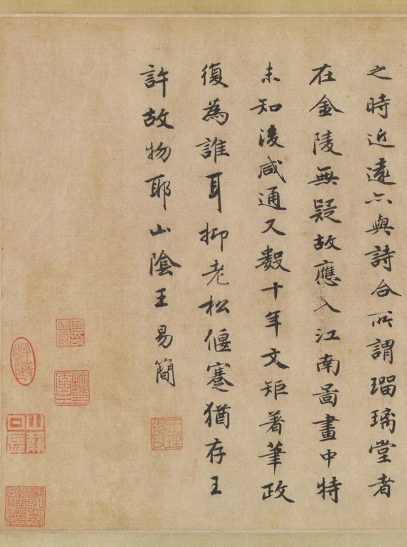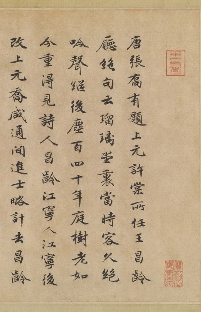 書法欣賞魏晉書法唐朝書法宋朝書法元朝書法明朝書法清朝書法近現代書法字典網>> 歷代書法>> 宋朝>> 王易簡·跋周文矩《琉璃堂人物圖》正文 王易簡·跋周文矩《琉璃堂人物圖》作者:王易簡 書體:楷書 王易簡跋周文矩《琉璃堂人物圖》,縱31.3厘米。美國大都會藝術博物館藏。王易簡的相關書法作品:王易簡·跋周文矩《琉璃堂人物圖》 王易簡小楷《跋保母帖》 相關文章:梁巘行書《節錄顏真卿爭座位帖立軸》 (行書)梁巘《節錄顏真卿爭座位帖立軸》紙本行草書 151×55.5cm 天津博物館藏。...王獻之《玉版十三行》魏晉小楷極品 (小楷)魏晉小楷是後世小楷變法的基礎,在鍾繇《宣示表》後,大體是有兩條發展脈絡:一條是按...阮元《臨乙瑛碑》 (隸書)阮元《臨乙瑛碑》,隸書,香港藝術館虛白齋藏。釋文:巍巍大聖,赫赫彌章,相乙瑛,字...清王朝御用玉璽二十五寶圖乾隆以前,清代皇帝寶璽一般沒有規定確切的數目。乾隆十一年(公元1746年),乾隆...9幅趙孟頫書畫題跋 (行楷)9幅趙孟頫書畫題跋欣賞:明代 姚綬《文字飲詩並序》 (行楷)姚綬《文字飲詩並序》 大都會藝術博物館藏,題於姚綬畫作《文飲圖》卷後,序部分以楷...張即之日本禪院題字 (楷書)張即之(1186—1263)善作擘窠大字,豐碩巨刻,散流江左。“方丈”被譽為張即...吳熙載篆書《宋武帝與臧燾敕》 (篆書)吳煕載,原名廷颺,字煕載,後因避穆宗載淳諱更字讓之,號晚學居士,江蘇儀征人。他長...蘇軾行書《黃州寒食詩帖》 (行書)《黃州寒食詩帖》,紙本,25 行,共129字,是蘇軾行書的代表作。這是一首遣興的...傅山草書《王公昨夜詩》軸 (草書)傅山《王公昨夜詩》軸 絹本 159x46cm 山西省博物館藏釋文:王公昨夜得霜裘...