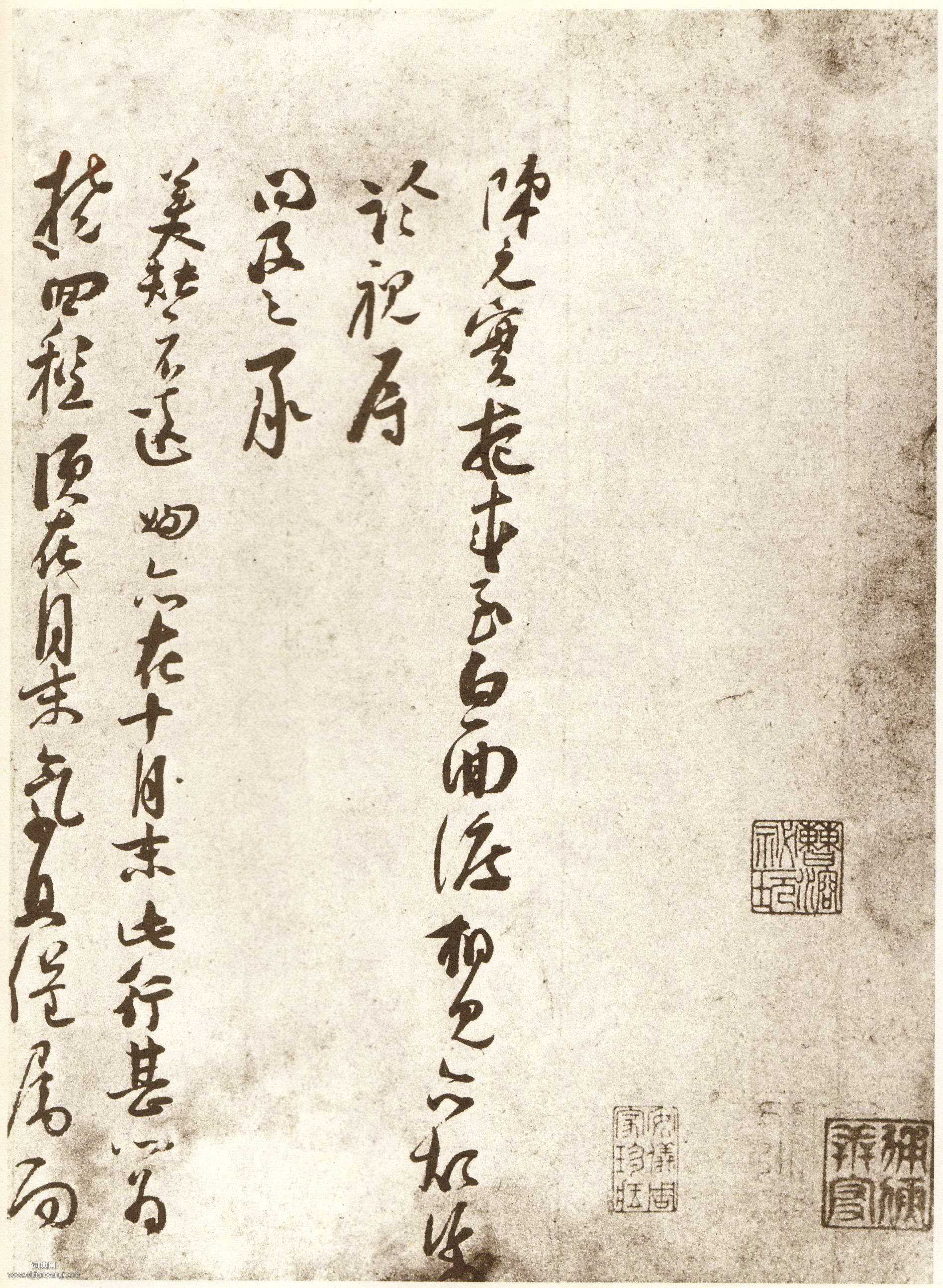 書法欣賞魏晉書法唐朝書法宋朝書法元朝書法明朝書法清朝書法近現代書法字典網>> 歷代書法>> 宋朝>> 蘇洵《陳元實夜來帖》正文 蘇洵《陳元實夜來帖》作者:蘇洵 書體:草書 蘇洵《陳元實夜來帖》,約1047(慶曆七年),紙本,34.5×50.9cm。台北故宮博物院藏。蘇洵的相關書法作品:蘇洵《陳元實夜來帖》 蘇洵《道中帖》 相關文章:翁方綱·行書七言詩 (行書)翁方綱 癸丑(1793年)作 行書七言詩 立軸。李宗瀚《行書四條屏》 (行書)李宗瀚《行書四條屏》灑金箋行書 120.8×27.7cm×4 上海博物館藏。...左宗棠行書《少年虛己七言聯》 (行書)左宗棠《行書“少年虛己”七言聯》紙本行書 166.2×38.7cm×2 台北...林則徐行書《上皇山採石》 (行書)林則徐《行書上皇山採石》軸 紙本 169X59.5cm 西泠印社藏 資料來...北魏楷書《鄭文公碑下碑》 (楷書)《鄭文公碑下碑》初拓本《鄭文公碑》,即《魏兗州刺史鄭羲碑》,北魏摩崖刻石,北魏宣...齊白石閒章精選 (篆書)齊白石篆刻初學浙派的丁敬、黃易,後學趙之謙、吳昌碩。從漢《祀三公山碑》得到啟發,...董其昌·梁武帝書評卷 (行書)《梁武帝書評》卷,明天啟五年(1625年),董其昌書,紙本,行書,縱26.5cm...寶璽印存《雍正寶藪》篆刻精品篆刻精品寶璽印存《雍正寶藪》完整版,現存巴黎,法國吉美博物館。封面 左上:雍正...楊維楨《跋鄧文原急就章》 (行書)楊維楨,字廉夫,號鐵崖,別號東維子、抱遺老人、鐵笛道人,老鐵貞、梅花道人等,諸暨...王文治行書《無江乃邦十言聯》 (行書)王文治《無江乃邦十言聯》紙本行書 乾隆五十二年(1787)常州博物館藏釋文:無江...