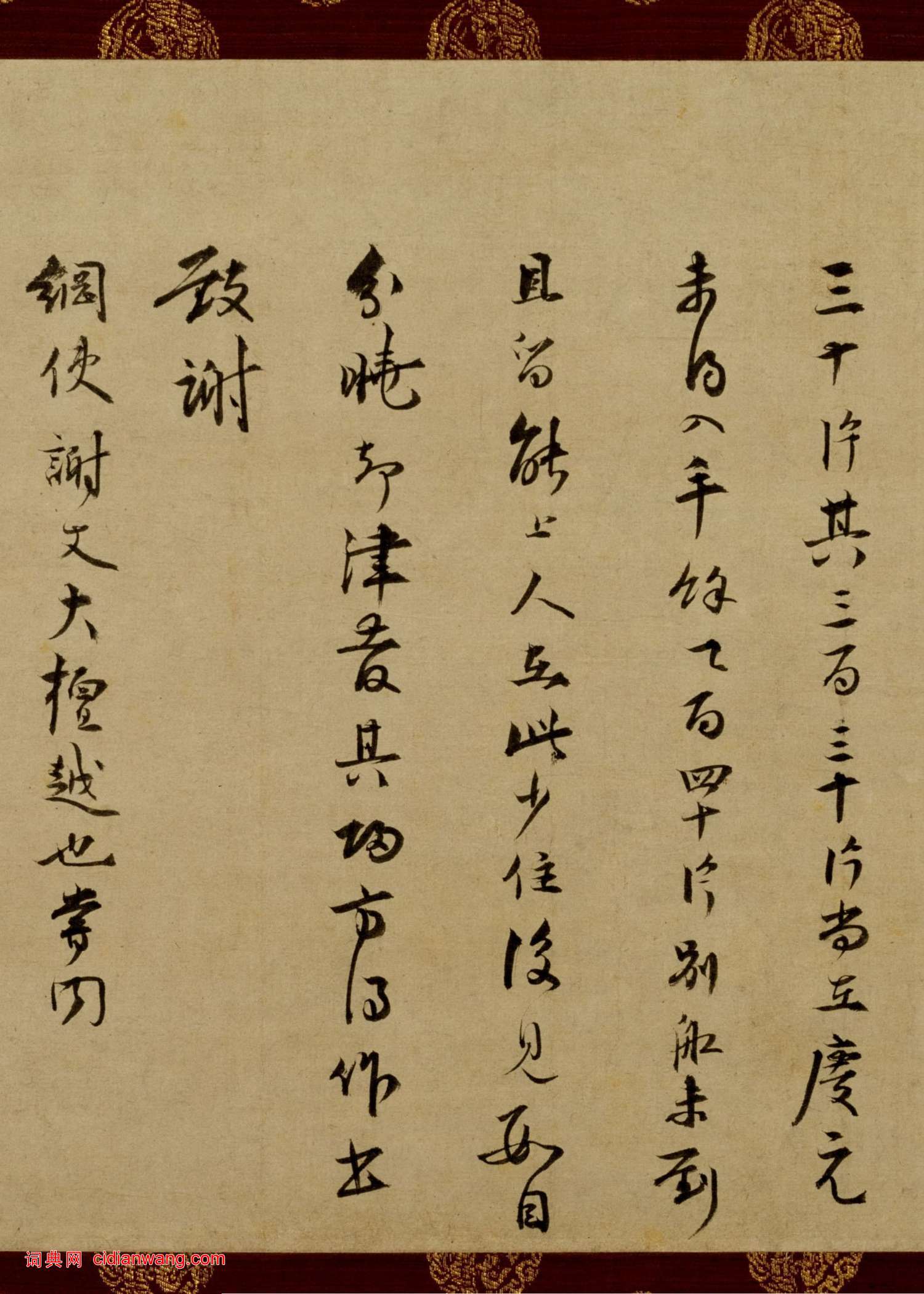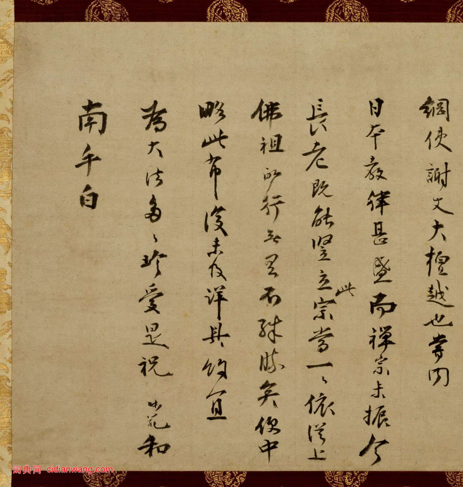 書法欣賞魏晉書法唐朝書法宋朝書法元朝書法明朝書法清朝書法近現代書法字典網>> 歷代書法>> 宋朝>> 無準師範·尺牘(3)正文 無準師範·尺牘(3)作者:無準師範 書體:行書 首 頁 上一頁 1 2 3 全文2015-11-19 13:02:28 相關文章:魯迅行書《錄歐陽炯南鄉子詞軸》 (行書)魯迅 《錄歐陽炯南鄉子詞軸》 80.7×32.9cm 1931年 上海魯迅紀念...文徵明·小楷蓮社圖記 (小楷)文徵明小楷《蓮社圖記》冊,紙本,縱25.5厘米,橫9.8厘米。釋文:龍眠李伯時為...吳昌碩《篆書執橐以樂四言聯》 (篆書)吳昌碩《篆書執橐以樂四言聯》 127.5×31.5cm×2 1918年 西泠...趙佶楷書《欲借風霜二詩帖》 (楷書)趙佶《欲借風霜二詩帖》紙本 楷書 33.2×63cm 台北故宮博物院藏這幅詩帖...陳洪綬《行草書詩》扇面 (行草)陳洪綬《行草書詩》扇面 金箋 23.5×51cm 約順治七年(約1650)浙江...于右任《草書寧靜以致遠軸》 (草書)于右任《草書寧靜以致遠軸》紙本草書 108.6×22cm 台北故宮博物院藏釋文...郭尚先《行書橫幅》 (行書)郭尚先《行書橫幅》紙本行書 45×97cm 淮安市博物館藏 釋文:趙文敏家藏小...龔賢·題《山水冊》 (行書)龔賢題《山水冊》,行書。龔賢(1618—1689)明末清初著名畫家,金陵八大家之...白蕉《書法十講》第十講 碑與帖 (不詳)第十講 碑與帖 書學上碑與帖的爭論,是遠自乾嘉以來的事。提倡碑的攻擊帖;喜歡帖的...蘇軾行書《渡海帖》 (行書)蘇軾《渡海帖》,行書,元豐三年(1100),紙本,28.6X40.2 cm 台北...