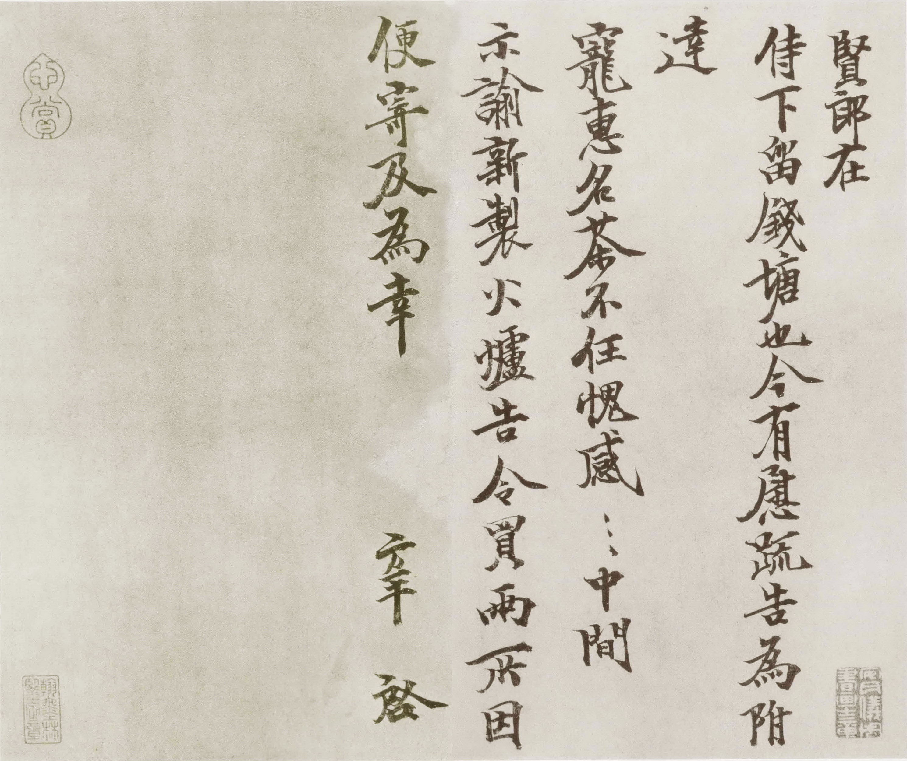 書法欣賞魏晉書法唐朝書法宋朝書法元朝書法明朝書法清朝書法近現代書法字典網>> 歷代書法>> 宋朝>> 張方平《名茶帖》正文 張方平《名茶帖》作者:張方平 書體:行書 【釋文】賢郎在侍下 留錢塘也 今有慰疏 告為附達 寵惠名茶 不任愧感愧感 中間示論 新制火爐 告今買兩所 因便寄及為幸 方平啟張方平《名茶帖》,行書,粉花白箋本,25×32.2cm。台北故宮博物院藏。此帖後有明人吳寬等人跋語,知此帖共有宋人五件書札,後僅剩此帖。相關文章:來楚生行書《臨黃道周榕壇問業軸》 (行書)來楚生《臨黃道周榕壇問業軸》紙本行書 105×51cm×2 1941年書 上...顏真卿楷書《東方朔畫贊碑》 (楷書)《東方朔畫贊碑》全稱《漢太中大夫東方先生畫贊碑》。自署天寶十三載(754年)十二...文徵明《跋右軍十七帖》 (楷書)文徵明《跋右軍十七帖》,楷書。《十七帖》為書聖王羲之的草書代表之作,不過原跡早已...伊秉綬隸書《臨漢張遷碑立軸》 (隸書)伊秉綬《臨漢張遷碑立軸》紙本隸書 84×46.5cm 福建博物院藏釋文:高帝龍...吳昌碩《篆書小花園橫幅》 (篆書)吳昌碩《篆書小花園橫幅》紙本篆書 46×185cm 1909年 西泠印社藏 釋...東晉《王仚之墓誌》 (隸書)東晉《王仚之墓誌》東晉《王仚之墓誌》,志為東晉太和三年(公元368年)刻。200...米友仁《瀟湘奇觀圖題跋》 (行書)【釋文】先公居鎮江四十年田菴於城之東圃岡上以海岳命名一時國士皆賦詩不能(記)翰林...米芾行書《寄魏泰詩帖》 (行書)米芾《寄魏泰詩帖》(即《與魏泰唱和詩帖》疑為摹本 ) 紙本 行書 縱26厘米 橫...高鳳翰《隸書聯捷詩軸》 (隸書)高鳳翰《隸書聯捷詩軸》綾本隸書 113.5cm×40.5cm 徐州市博物館藏釋...十招教你寫好楷書!1、寫楷書要端莊平靜而重心準立晉代書法家王羲之說:“凡是寫字貴在平正安穩,首先是...