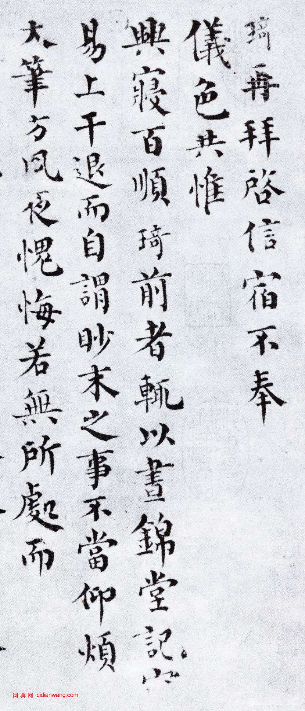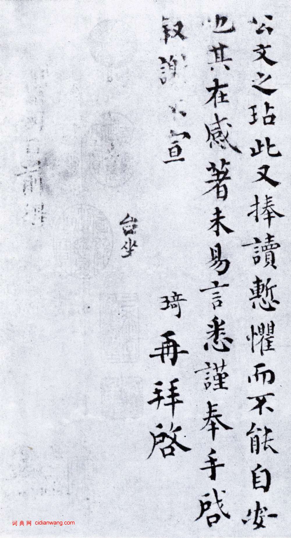 【釋文】琦再拜啟:信宿不奉儀色,共(恭)惟興寢百順。琦前者輒以《晝錦堂記》(容)易上乾,退而自謂眇末之事,不當仰煩大筆,方夙夜愧悔,若無所處,而公遽以記文為示,雄辭濬發,譬夫(江)河之決,奔騰放肆,勢不可禦。從而視□,圈聳駭奪魄,烏能測其淺深哉!□褒假太過,非愚不肖之所勝,遂傳□之大,恐為公文之玷,此又捧讀慚懼而不能自安也。其在感著,未易言悉。謹奉手啟敘謝,不宣。琦再拜啟,□□□□台坐。