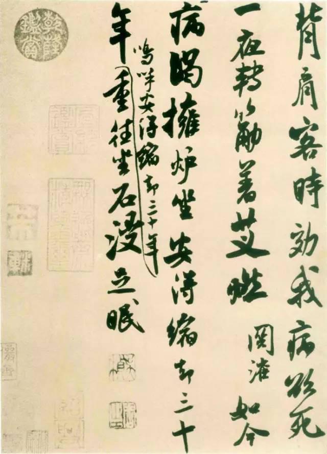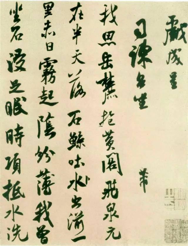 【釋文】:戲成呈司諫台坐,芾。我思嶽麓抱黃閣,飛泉元在半天落。石鯨吐水(點去)出湔—里,赤目霧起陰紛薄。我曾坐石浸足眠,時項抵水洗背肩。客時效我病欲死,—夜轉筋著艾燃。關漼。如今病渴擁爐坐,安得縮卻三十年。嗚呼!安得縮卻三十年,重往坐石浸足眠。
