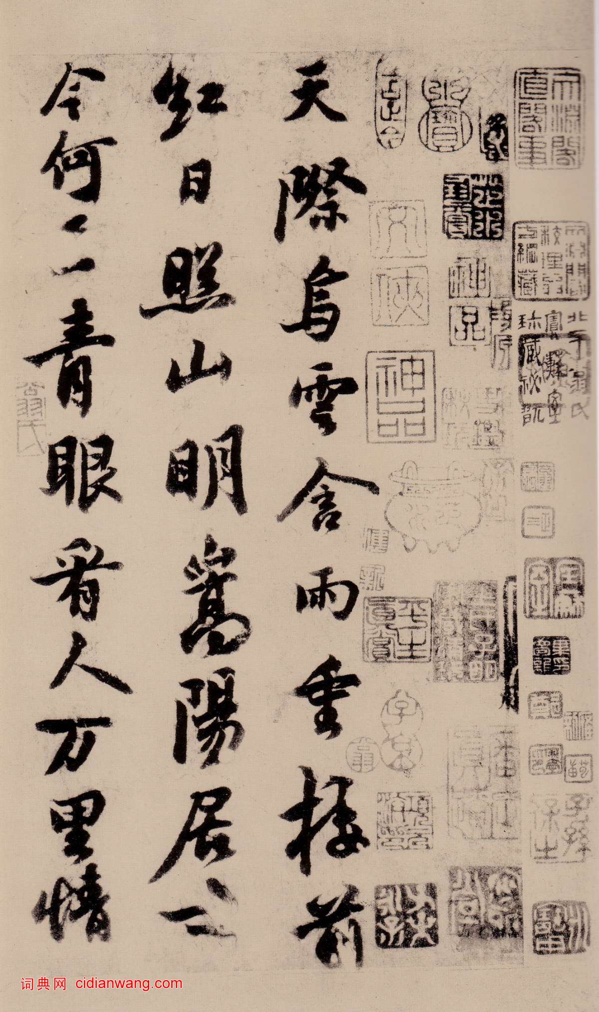 北宋 蘇軾 《天際烏雲帖》又稱《嵩陽帖》,蘇軾詩文一章,行書,真跡曾由明代項元汴收藏,清歸翁方綱,有翁氏題跋。共三十六行,計三百零七個字。藏處不詳。約熙寧十年(1077)至元祐丁卯(1087)這十餘年中所書。全篇字態凝重而饒有韻致,筆畫圓渾樸茂,一點一畫恰具有力屈萬夫之力度。