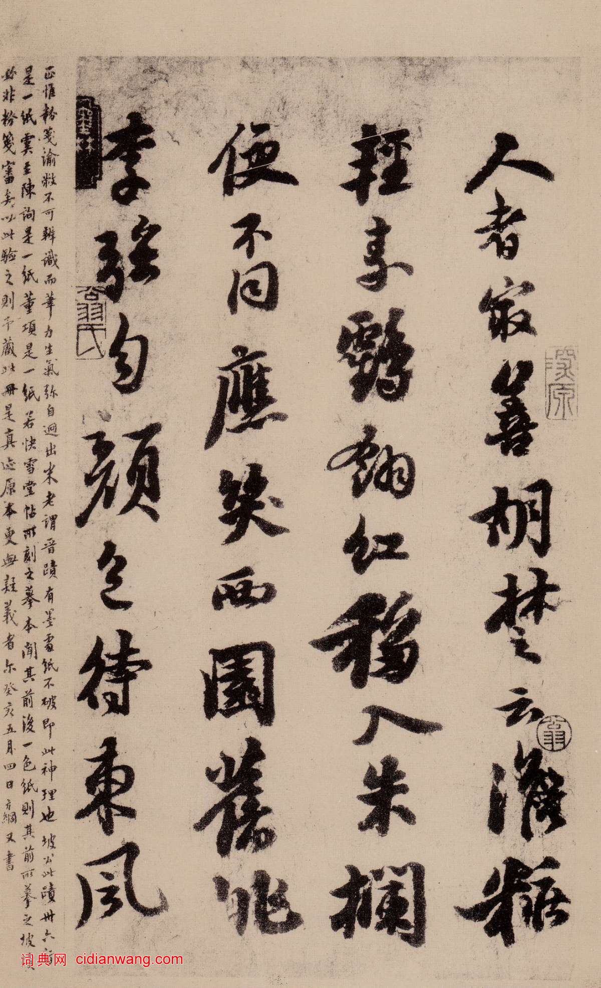 書法欣賞魏晉書法唐朝書法宋朝書法元朝書法明朝書法清朝書法近現代書法字典網>> 歷代書法>> 宋朝>> 蘇軾《天際烏雲帖》(4)正文 蘇軾《天際烏雲帖》(4)作者:蘇軾 書體:行書 首 頁 上一頁 1 2 3 4 全文2016-3-1 13:19:38 蘇軾的相關書法作品:蘇軾行書《久留帖》 蘇軾小楷《般若波羅密多心經》 蘇軾行書《黃州寒食詩帖》 蘇軾行書《榿木卷帖》 蘇軾行書《李白仙詩卷》 蘇軾行書《陽羨帖》 蘇軾行書《東武帖》 蘇軾行書《王晉卿帖》 蘇軾行書《致運句太博帖》 相關文章:文徵明·草堂十志 (小楷)文徵明小楷《草堂十志》。這件小楷字跡清秀、婀娜多姿,是文徵明傳世之作中的一件精品...張瑞圖《行書除卻判無七言聯》 (行書)張瑞圖《行書除卻判無七言聯》軸 紙本 281.9 × 45.7厘米 ×2 ...趙昀行書《暮春詩團扇》 (行書)宋理宗趙昀《暮春詩團扇》 24.4 x 23.5 cm 美國紐約大都會博物館藏 ...張瑞圖《行書不知圓通老詩》 (行書)張瑞圖《行書不知圓通老詩》軸 紙本 170×43.5厘米 年代不詳 北京故宮...北齊《文殊般若經碑》 (楷書)《北齊文殊般若經碑》刻石無年代,以書法風格列入北齊。文殊般若經書法不似隋唐以後楷...虞集·跋何澄歸莊圖卷 (行草)【釋文】歸去來圖作者極多惟何秘監此作取捨萬殊動定不一非他所可比者因嘆美之遂成一絕...東漢隸書《魯峻碑》 (隸書)此碑全稱《漢司隸校尉忠惠公魯君碑》,又名《漢司隸校尉魯峻碑》、《魯忠惠碑》。東漢...鄧石如《四體書冊》之《少學琴書隸書冊》 (隸書)鄧石如《四體書冊》之《少學琴書隸書冊》 嘉慶二年(1797)日本東京國立博物館藏...黃道周行書《臨王羲之誓墓文》 (行書)黃道周《臨王羲之誓墓文》絹本 24.5×295.4cm 崇禎九年(1636) ...北魏楷書《穆亮墓誌》 (楷書)魏碑的風格大致可以分為兩大類:其一為雄健渾厚、豪邁奇宕一路,諸如《龍門二十品》、...
