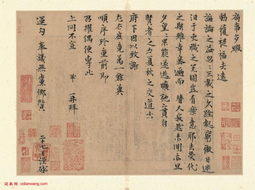 局事帖釋文:局事多暇。動履禔福。去遠海誨之益。忽忽三載之久。跧處窮徼。日迷汨於吏職之冗。固豈有樂意耶。去受代之期。難幸密邇。而替人寂然未聞。亦旦夕望望。果能遂逃曠弛。實自賢者之力。夏秋之交。道出府下。因以致謝左右。庶竟萬一。余冀順序珍重。前即召擢。偶便專此上問。不宜。鞏再拜。運勾奉議無黨鄉賢。二十七日。謹啟。 印文:曾鞏再拜