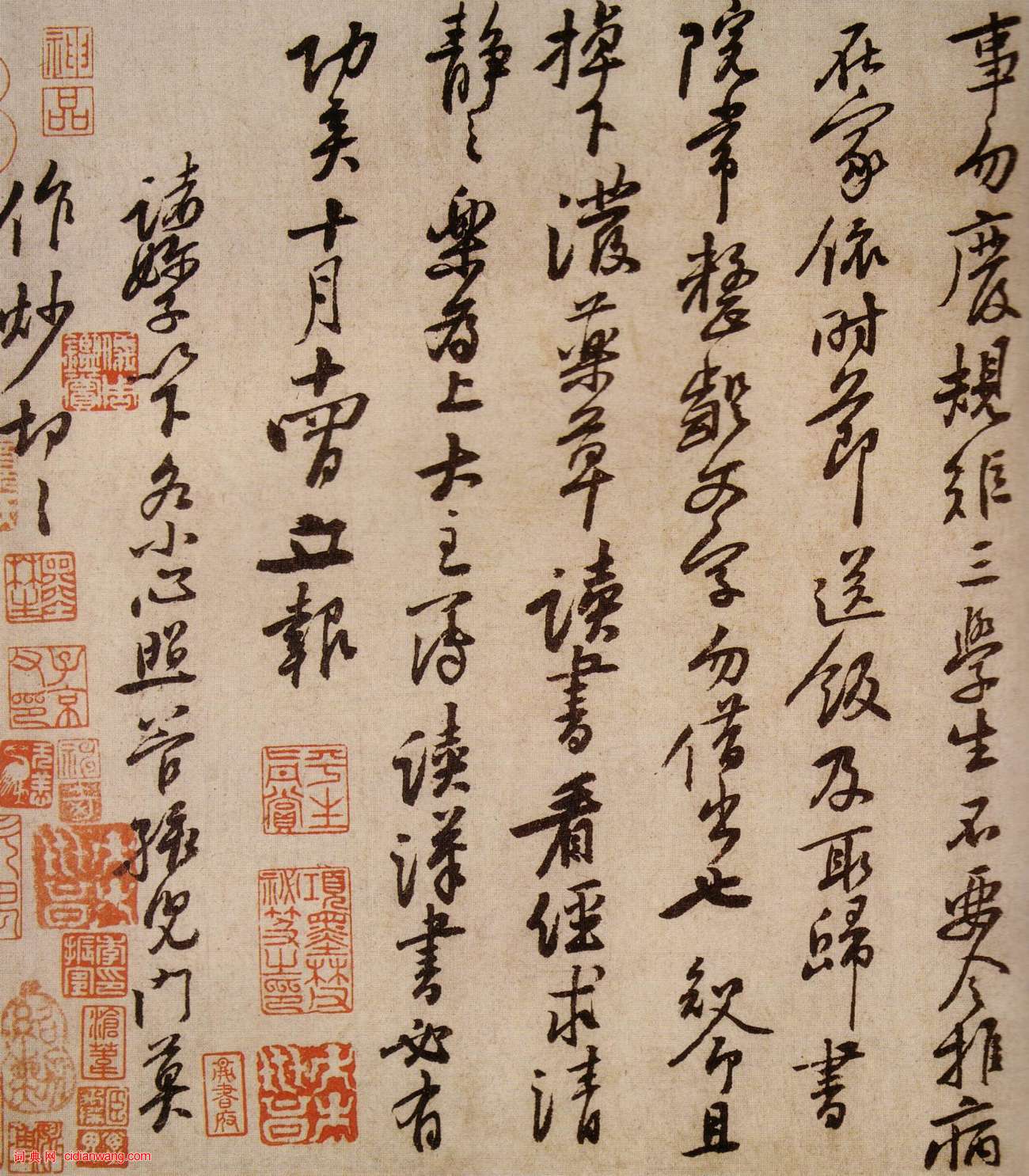 天民、知命、大主簿:霜寒,想八嫂安裕、九妳、四妳、大新婦、普姐、師哥、四娘、五娘、六郎、四十、明兒、九娘、十娘、張九(咩兒)、韓十、小韓、曾兒、湖兒、井兒,各安樂。過江來,甚思汝等,寂寞且耐煩,不須憂路上,路上甚安穩。但所經州郡多故舊,須爲酒食留連爾。家中上下,凡事切且和順。三人輪管家事,勿廢規矩。三學生不要令推病在家,依時節送飯及取歸。書院常整齪、文字勿借出也。知命且掉下潑藥草,讀書看經,求清靜之樂爲上,大主簿讀《漢書》必有功矣。十月十四日,立報。諸嬭子以下,各小心照管孩兒們,莫作炒,切切。