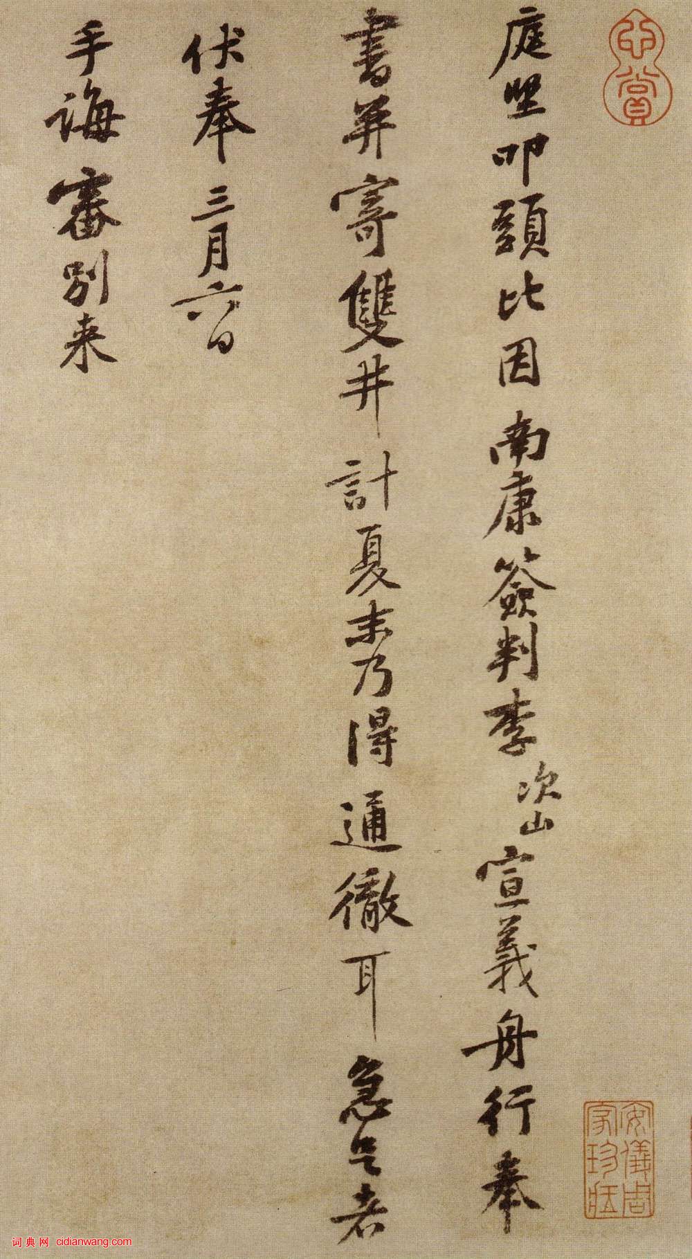 庭堅叩頭。比因南康簽判李次山宣義舟行。奉書。並寄雙井。計夏末乃得通徹耳。急足者伏奉三月六日手誨。審別來侍奉萬福。何慰如之。