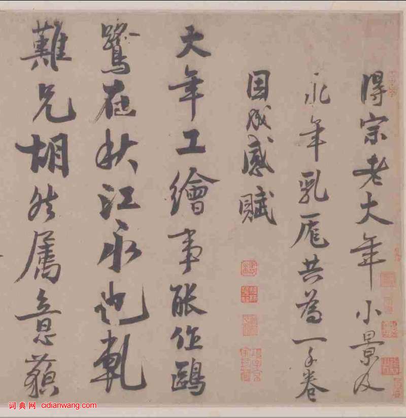 即《題大年小景圖》,行書。紙本。縱35.8厘米,橫675.6厘米。現藏北京故宮博物院。該卷書於宋理宗開慶元年(公元1259年)作者時年60歲。其內容包括《題大年小景圖》、《題永年乳龐年》、《西塘道》、《題天文地理圖》等八首。