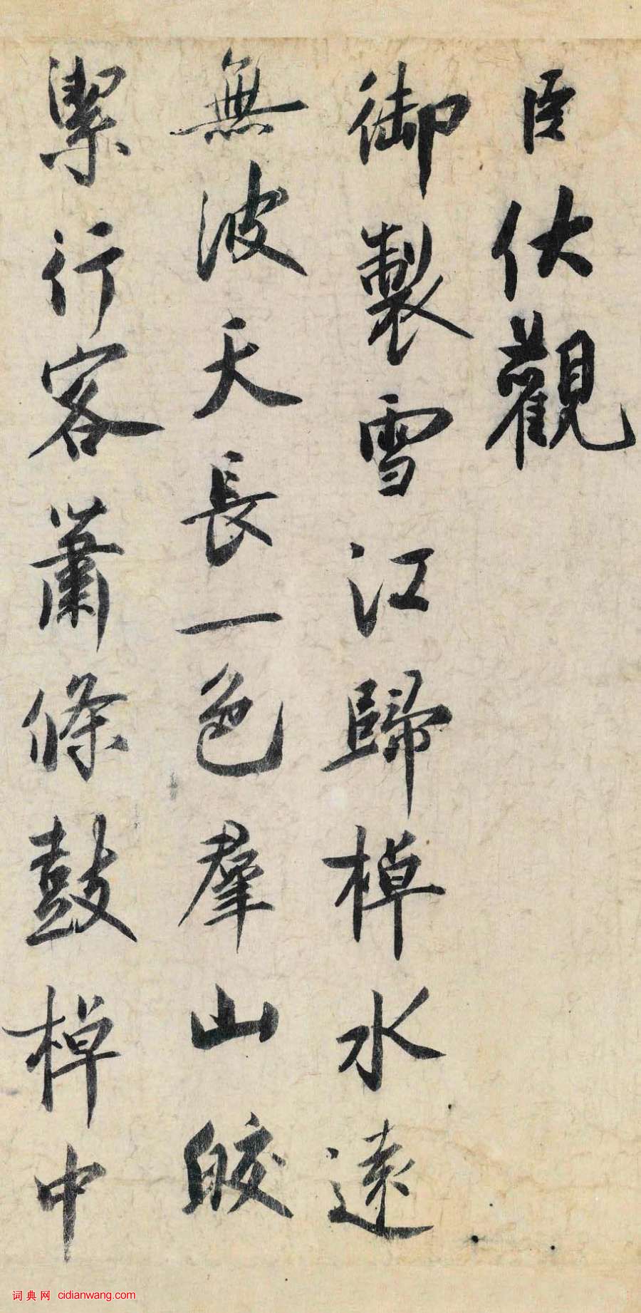 “臣伏觀御製雪江歸棹,水遠無波,天長一色。群山皎潔,行客蕭條。鼓棹中流,片帆天際。雪江歸棹之意盡矣。天地四時之氣不同,萬物生於天地間。隨氣所運,炎涼晦明。生息榮枯,飛走蠢動。變化無方,莫之能窮。 皇帝陛下以丹青妙筆,備四時之景色,究萬物之情態於四圖之內,蓋神智與造化等也。大觀庚寅季春朔日,太師楚國公致仕臣京謹識。”蔡京的此段題跋非常重要,一是說明《雪江歸棹圖卷》為徽宗御製;二是說明《雪江歸棹圖卷》是原來的春、夏、秋、冬四時圖之一。三是說明此圖卷約完成於大觀庚寅四年(1110)之前,時宋徽宗二十九歲。所以後來許多的著錄書籍、畫史研究家和鑑定家均依此認定《雪江歸棹圖卷》為宋徽宗真跡。