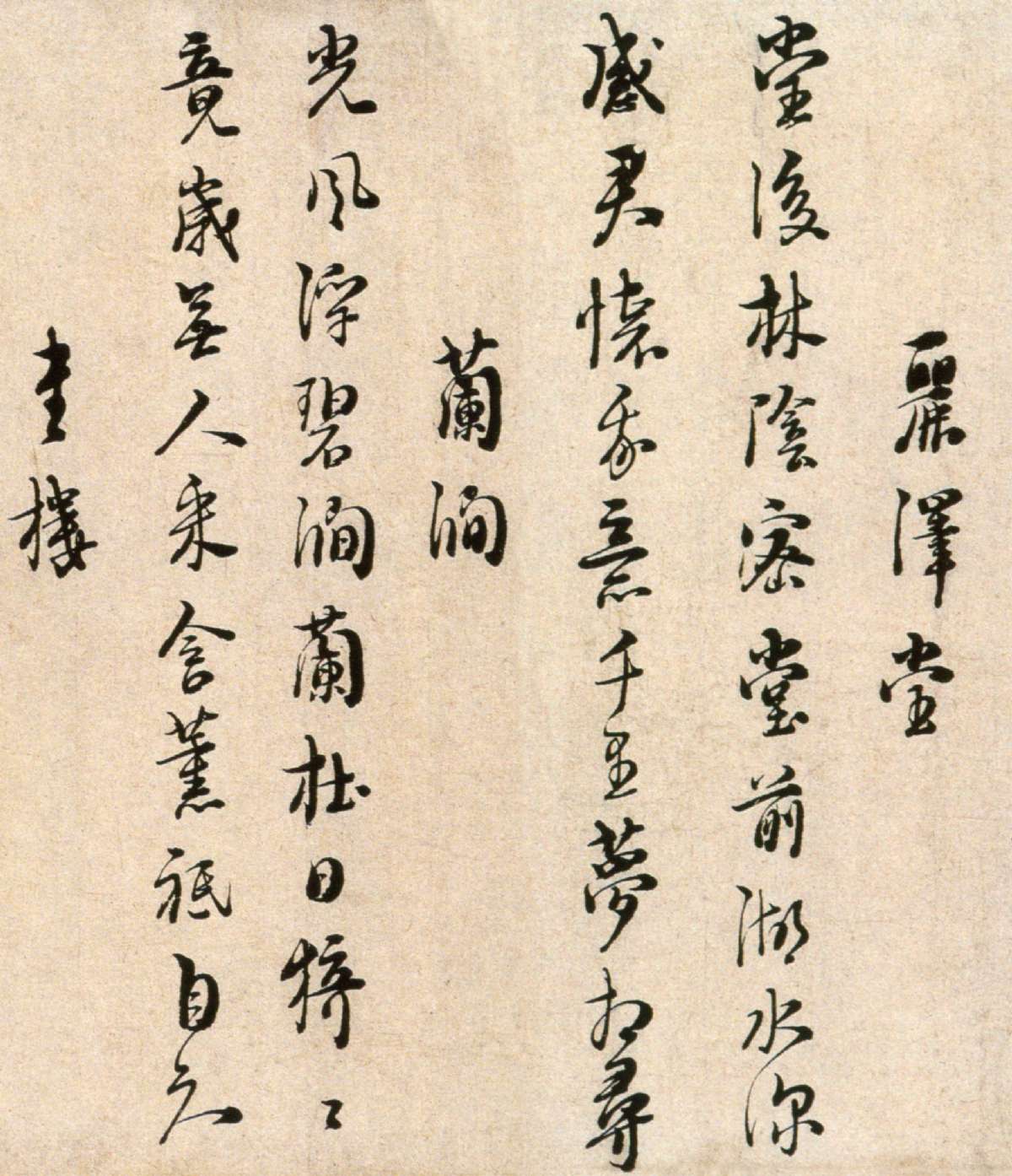 書法欣賞魏晉書法唐朝書法宋朝書法元朝書法明朝書法清朝書法近現代書法字典網>> 歷代書法>> 宋朝>> 朱熹行書《城南唱和詩卷》(3)正文 朱熹行書《城南唱和詩卷》(3)作者:朱熹 書體:行書 麗洋堂堂後林陰密,堂前湖水深。感君懷我意,千里夢相尋。蘭澗光風浮碧澗,蘭杜日猗猗。竟歲無人采,含薰只自知。首 頁 上一頁 1 2 3 4 5 6 7 8 9 10 下一頁 尾 頁朱熹的相關書法作品:朱熹行書《城南唱和詩卷》 朱熹草書《秋深帖》 朱熹·跋歐陽修《集古錄跋》 朱熹《與彥修少府帖》 朱熹《卜築帖》 朱熹《大桂驛中帖》 朱熹《論語集注殘稿》 相關文章:瘞鶴銘 (楷書)《瘞鶴銘》殘片焦山摩崖石刻《瘞鶴銘》刻於南朝·梁(傳)天監十三年(514年),...張問陶《七律詩軸》 (行書)張問陶《七律詩軸》,行書。朱熹《論語集注殘稿》 (草書)【釋文】子曰:“仁者其言也訒。”[訒,音刃。訒, 忍也, 難也。仁者心存而不放,...田蘊章楷書字帖300字 (楷書)《田蘊章楷書300字》里大多數的字在之前的每日一題每日一字里都有講到,而且都帶有...左宗棠篆書《誼而恭近六言聯》 (篆書)左宗棠《篆書“誼而恭近”六言聯》 122.5×28.5×2 湖南省博物館藏釋...鄭燮《行書七言詩軸》 (行書)鄭燮《行書軸》 105 x 50 台北故宮博物院藏(蘭千山館暫存)釋文:皓首歸...趙孟頫兩版臨作《蘭亭序》 (行書)趙孟頫,作為元代書壇的領袖人物,一改尚意潮流,轉而深入二王傳統。他對二王經典行書...楊凝式《神仙起居法帖》 (草書)《神仙起居法帖》,五代楊凝式書。紙本,草書。縱27cm,橫21.2cm。草書8行...趙佶草書《千字文》 (草書)趙佶《草書千字文》描金雲龍箋 31.5×1172cm 宣和四年(1122年)遼...書法欣賞三步曲,怎么欣賞書法在很多人看來,書法高深莫測,覺得是內行人的事,其實,書法是全中國人的事,你可以不...