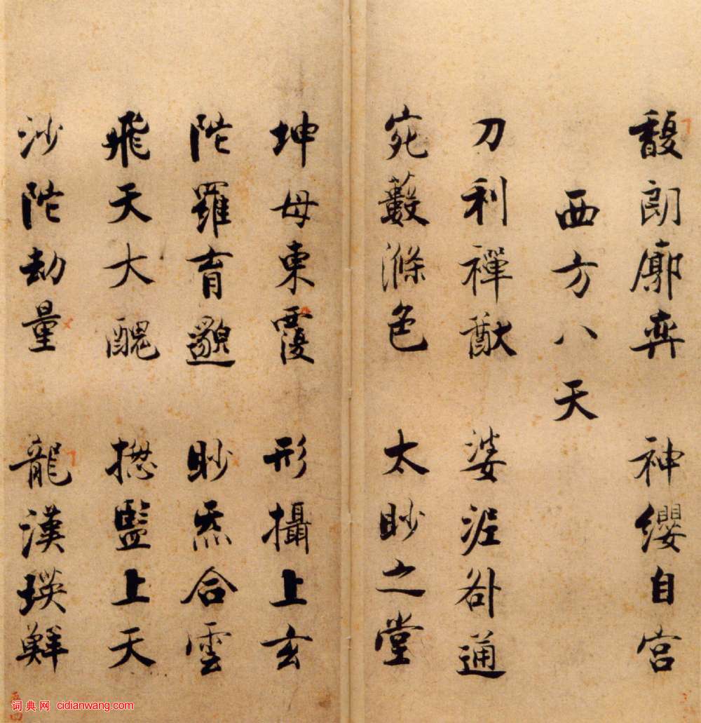 資源下載魏晉書法唐朝書法宋朝書法元朝書法明朝書法清朝書法近現代書法字典網>> 歷代書法>> 宋朝>> 張即之楷書《度人經帖》(28)正文 張即之楷書《度人經帖》(28)作者:張即之 書體:楷書 首 頁 上一頁 21 22 23 24 25 26 27 28 29 30 下一頁 尾 頁張即之的相關書法作品:張即之行楷《金剛般若波羅蜜經》 張即之行書《致殿元學士尺牘》 張即之行書《致尊堂太安人尺牘》 張即之行書《棐茗帖》 張即之行草《莊幹帖》 張即之行書《台慈帖頁》 張即之楷書《雙松圖歌卷》 張即之楷書《王禹偁待漏院記卷》 張即之小楷《佛遺教經》 相關文章:蘇軾·洞庭春色賦中山松醪賦合卷 (行書)《洞庭春色賦》與《中山松醪賦》,均為蘇軾撰並書。此兩賦並後記,為白麻紙七紙接裝,...李衎行書 《跋四清圖卷》 (行書)李衎《跋四清圖卷》行書 北京故宮博物院藏李衎《四清圖》紙本墨筆,縱35.6厘米,...洪亮吉《篆書家參詩在七言聯》 (篆書)洪亮吉《篆書家參詩在七言聯》紙本篆書 97.5×17cm×2 常州博物館藏 ...西漢隸書《銀雀山漢簡》 (隸書)《銀雀山漢簡》 《銀雀山漢簡》於一九七二年四月間在山東臨沂銀雀山的兩座前漢墓中出...石鼓文 (篆體)石鼓文,秦刻石文字,因其刻石外形似鼓而得名。發現於唐初,共十枚,高約二尺,徑約三...康有為行書《五言聯》 (行書)行書五言聯 左右各縱 162厘米,紙本 西安碑林博物館藏資料來自西安碑林博物館董其昌楷書《金剛經》 (楷書)罕見明代大書法家董其昌楷書欣賞《金剛經》(無缺字本),主編:楊璐,中國書店出版社...北魏《姚伯多造像記》 (楷書)《姚伯多造像記》亦稱《姚文遷造像碑》,《姚伯多兄弟造成石文像》。 姚伯多造像碑是...吳昌碩篆書《石鼓文賢如七言聯》 (篆書)吳昌碩《石鼓文賢如七言聯》 133.6×27.9cm×2 紐約蘇富比2016...祝允明小楷《東坡記游卷》 (小楷)祝允明小楷《東坡記游卷》《東坡記游卷》為紙本,縱13.4厘米,橫269.6厘米,...