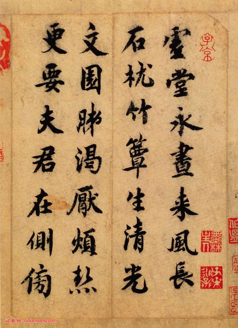 “虛堂詩帖”寫的比較用心,起筆處常常有小尖鋒入筆,逆鋒虛搶,如“簟”字最後一橫畫便是。幾乎所有的字點畫都很認真,撇捺均送到位,也正因此,多了幾分拘謹,略輸流暢自然。蔡襄書曾學顏真卿,從“光”字的最後一筆能清楚地看出顏書味來,歐陽修說:“蘇子美兄弟後,君謨書獨步當世;筆有師法。”君謨是蔡襄的字。釋文:虛堂永晝來風長,石枕竹簟生清光。文園肺渴厭煩熱,更要夫君在側傍。
