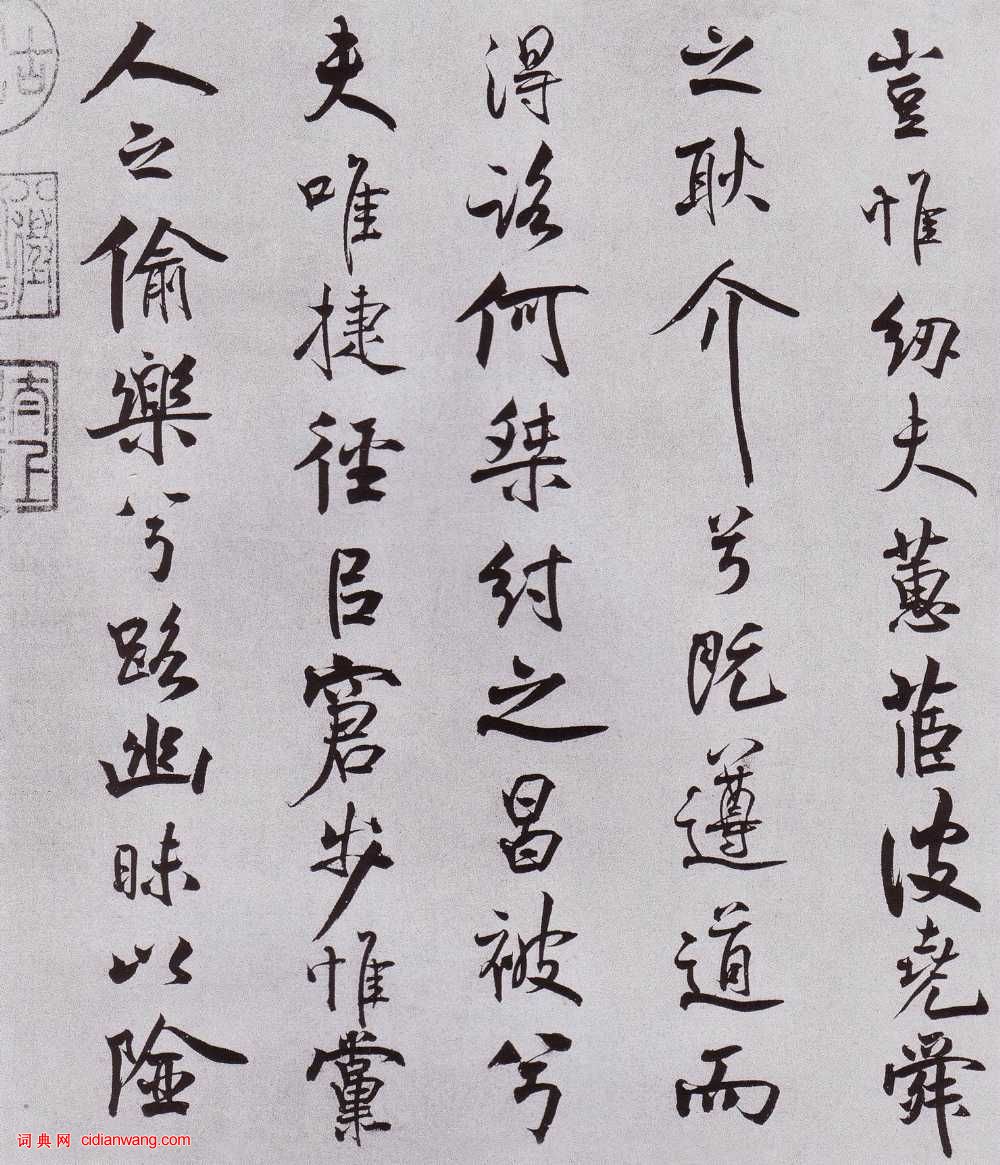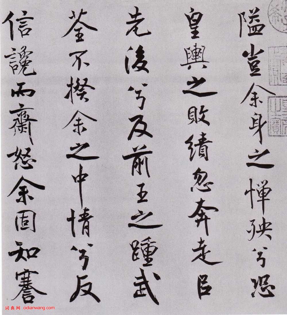 書法欣賞魏晉書法唐朝書法宋朝書法元朝書法明朝書法清朝書法近現代書法字典網>> 歷代書法>> 宋朝>> 米芾行書《離騷經》(4)正文 米芾行書《離騷經》(4)作者:米芾 書體:行書 首 頁 上一頁 1 2 3 4 5 6 7 8 9 10 下一頁 尾 頁米芾的相關書法作品:米芾《惠柑帖》 米芾行楷《王略帖贊》 米芾《道林詩帖》 米芾·新恩帖 米芾行書《千字文》集字 米芾《清和帖》 米芾《中秋詩帖》 米芾《伯充帖》 米芾《陳攬帖》 相關文章:歐顏柳趙,楷書入門怎樣選?楷書四大家是對書法史上以楷書著稱的四位書法家的合稱,也稱四大楷書。他們分別指是:...王守仁草書 《龍江留別詩》 (草書)王守仁《龍江留別詩》紙本 草書 28.1×296.6厘米 正德十一年(1516...尤袤·跋歐陽修《集古錄跋》 (行書)【釋文】卷有米襄陽題。尤可寶玩。楊統碑跋。歎其名之磨滅。蓋公偶未考尒。統以建寧元...王羲之小楷《黃庭經》 (小楷)《黃庭經》和《樂毅論》是王羲之小楷代表作品。《黃庭經》末署“永和十二年(356)...康熙行書《千字文》精品 (行書)康熙皇帝(1654—1722),順治皇帝第三子。康熙帝遍臨諸家法帖,尤其對董其昌...張謇《行書行道過情七言聯》 (行書)張謇《行書行道過情七言聯》紙本行書 145×36.9cm×2 上海博物館藏釋...楊維楨草書《張氏通波阡表卷》 (草書)元代楊維楨晚年草書的代表作品《張氏通波阡表》,章草書法長卷,至正25年(1365...梁漱溟行書《錄林宰平詩一首》 (行書)梁漱溟《錄林宰平詩一首》行書 釋文: 安得胸如海樣寬,瞭然人事著悲歡。水天極...劉炳森隸書《百家姓》 (隸書)劉炳森《隸書百家姓》,時在丙子桃月中浣,雍陽海村農劉炳森,書於瑞德草堂晴窗。百家...趙之謙行書《致艾臣書札》 (行書)趙之謙行書《致艾臣書札》 釋文:艾臣姻世叔大人閣下:忽忽十年,莫進尺一。故鄉灰燼...