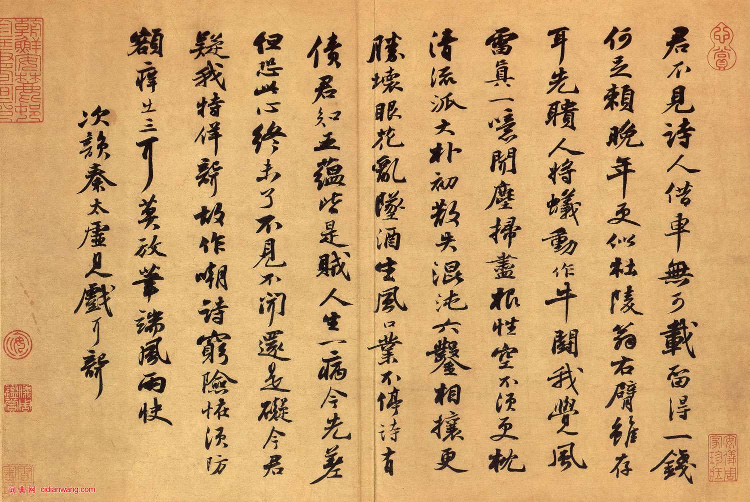 【釋文】君不見詩人借車無可載,留得一錢何足賴。晚年更似杜陵翁,右臂雖存耳先聵。人將蟻動作牛斗,我覺風雷真一噫。聞塵掃盡根性空,不須更枕清流派。大朴初散失渾沌,六鑿相攘更勝敗。眼花亂墜酒生風,口業不停詩有債。君知五蘊皆是賊,人生一病今先差。但恐此心終未了,不見不聞還是礙。今君疑我特佯聾,故作嘲詩窮險怪。須防額癢出三耳,莫放筆端風雨快。次韻秦太虛見戲耳聾。