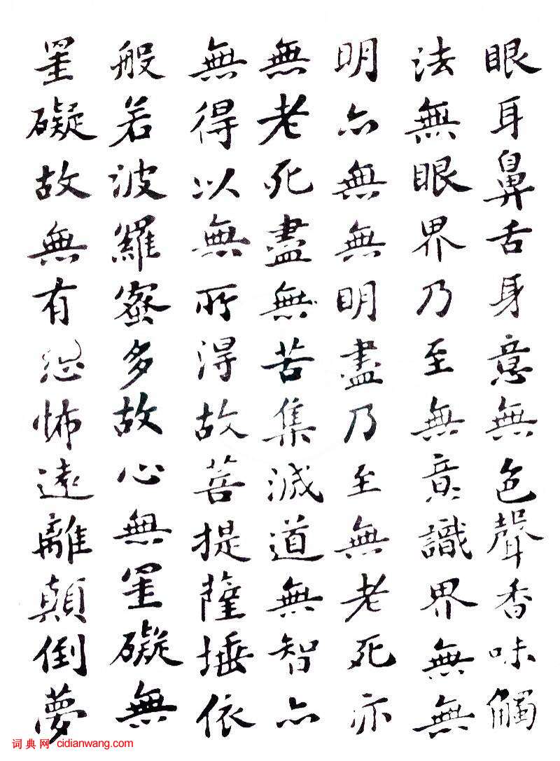 是故空中無色,無受想行識,無眼耳鼻舌身意,無色聲香味觸法,無眼界,乃至無意識界。無無明,亦無無明盡,乃至無老死,亦無老死盡。無苦集滅道,無智亦無得。以無所得故,菩提薩埵,依般若波羅蜜多故,心無掛礙,無掛礙故,無有恐怖,遠離顛倒夢想,究竟涅槃。三世諸佛,依般若波羅蜜多故,得阿耨多羅三藐三菩提。故知般若波羅蜜多,是大神咒,是大明咒,是無上咒,是無等等咒,能除一切苦,真實不虛。故說般若波羅蜜多咒,即說咒曰:“揭諦揭諦,波羅揭諦,波羅僧揭諦,菩提薩婆訶。”