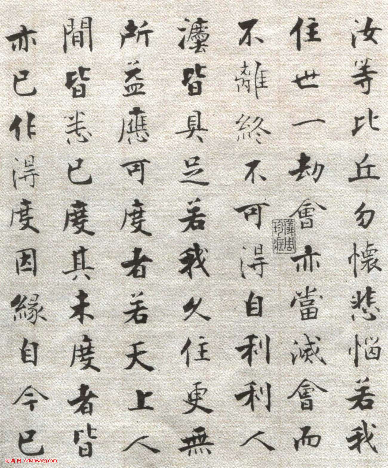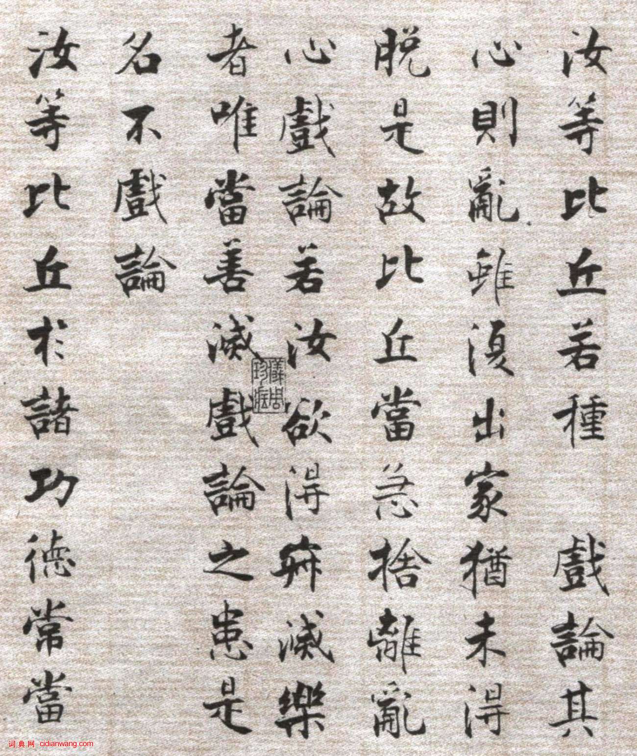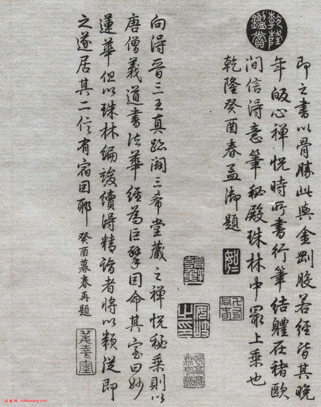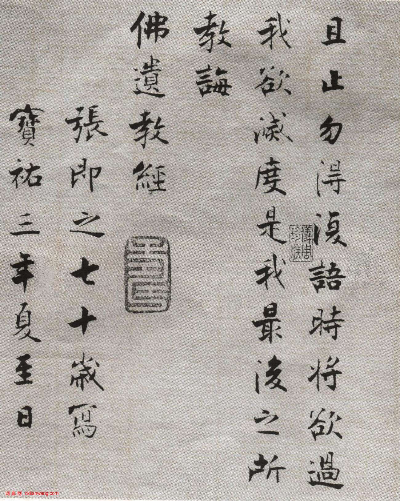《佛遺教經》為釋迦牟尼涅槃前最後一次說法的記錄,姚秦三藏法師鳩摩羅什漢譯,是佛教重要經典。署款“張即之七十歲寫,寶祐三年夏至日”,是張氏晚年寫經精品之一。楷書取法唐人,個人風格鮮明。結字緊峭,用筆靈動而有呼應顧盼之勢,人稱“以行作楷”。原為經折裝,後改為長卷。卷內有清高宗弘曆引首、卷尾題識;鈐有清安岐、乾隆內府、袁勵準諸鑑藏印章。