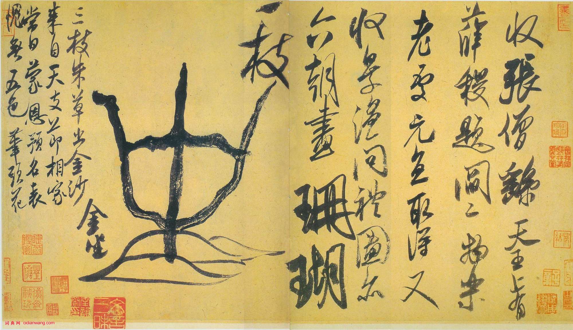 《珊瑚帖》——收張僧繇天王,上有薛稷題;閻二物,樂老處元直取得。又收景溫問禮圖,亦六朝畫。珊瑚一枝(畫珊瑚筆架一座,旁書金坐二字)。三枝朱草出金沙,來自天支節相家。當日蒙恩預名表,愧無五色筆頭花。