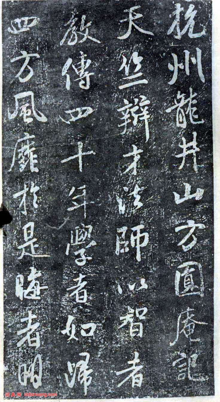 《方圓庵記》 宋元豐六年(1083)四月九日,杭州南山僧官守一法師到龍井壽聖院辯才住所方圓庵拜會辯才,二人講經說法,談古論經,十分投機。為此,守一寫了《龍井山方圓庵記》一文,以示紀念。此碑由米芾書。原石於北宋元豐六年(1083年)刻。書法腴潤秀逸,乃米芾"集古字"時期佳作,多從集王聖教出,頗有可玩味處。