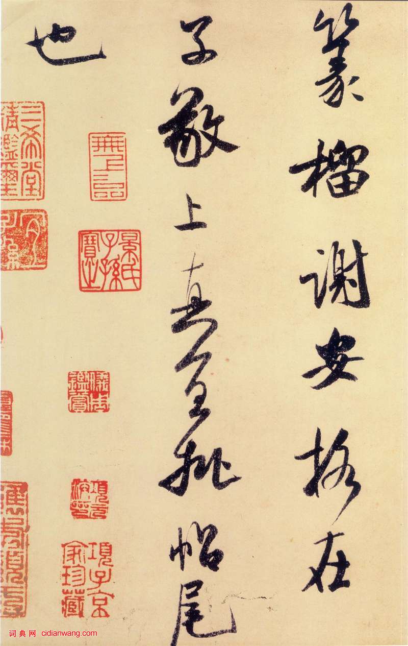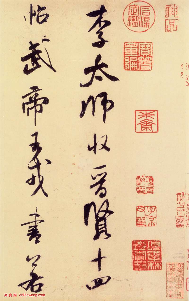 米芾《三帖卷》 計《叔晦帖》,《李太師帖》,《張季明帖》,均紙本,行書。《三帖》合裝一卷,為米芾行書中的精品。項元汴認為米芾此帖書風於王羲之相近。米芾的書法的確得力二王最多。但與二王父子書法又有不同,王羲之法度緊斂古質蘊藉內含;而王獻之的筆致則是散朗妍妙,俊逸姿媚。米芾的天資個性於王獻之較為相近,所以,米芾的結體,用筆中多可以見王獻之的風骨。
