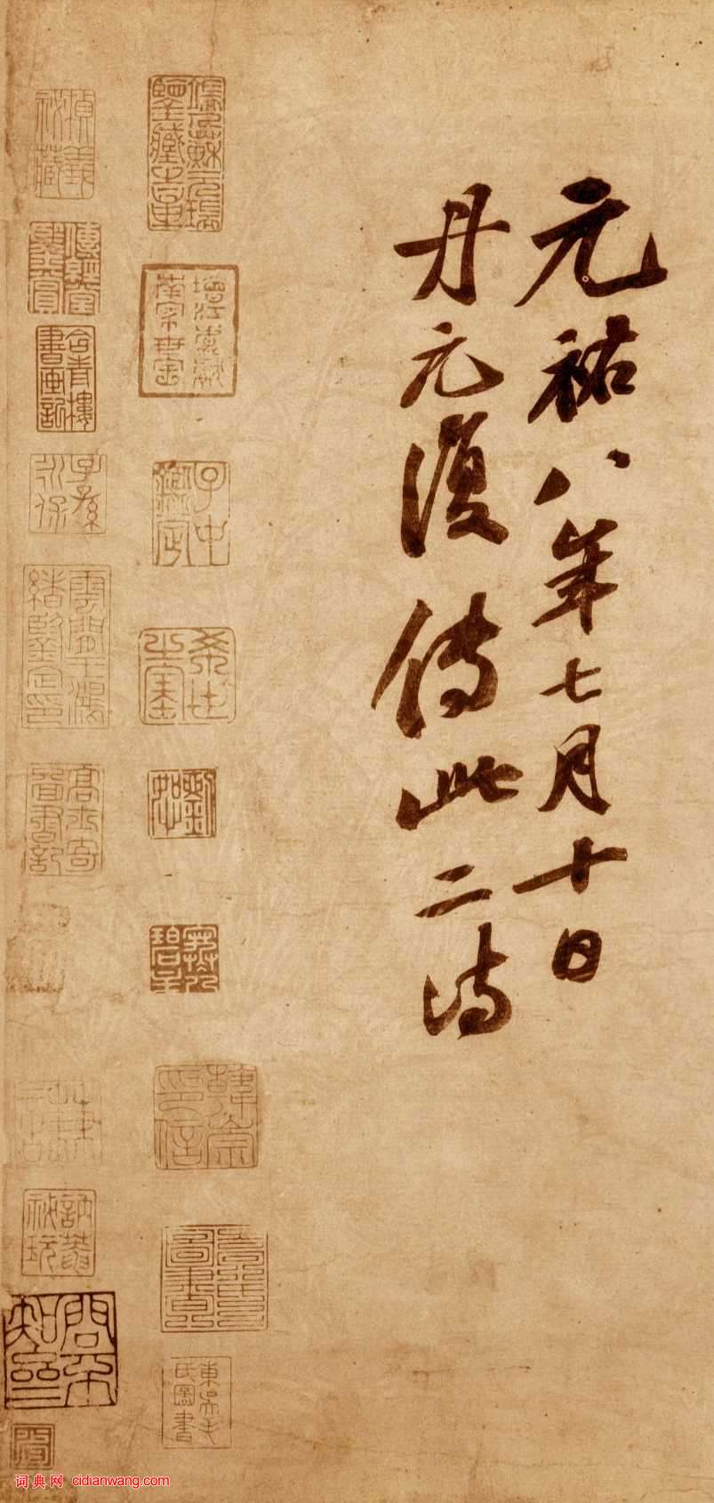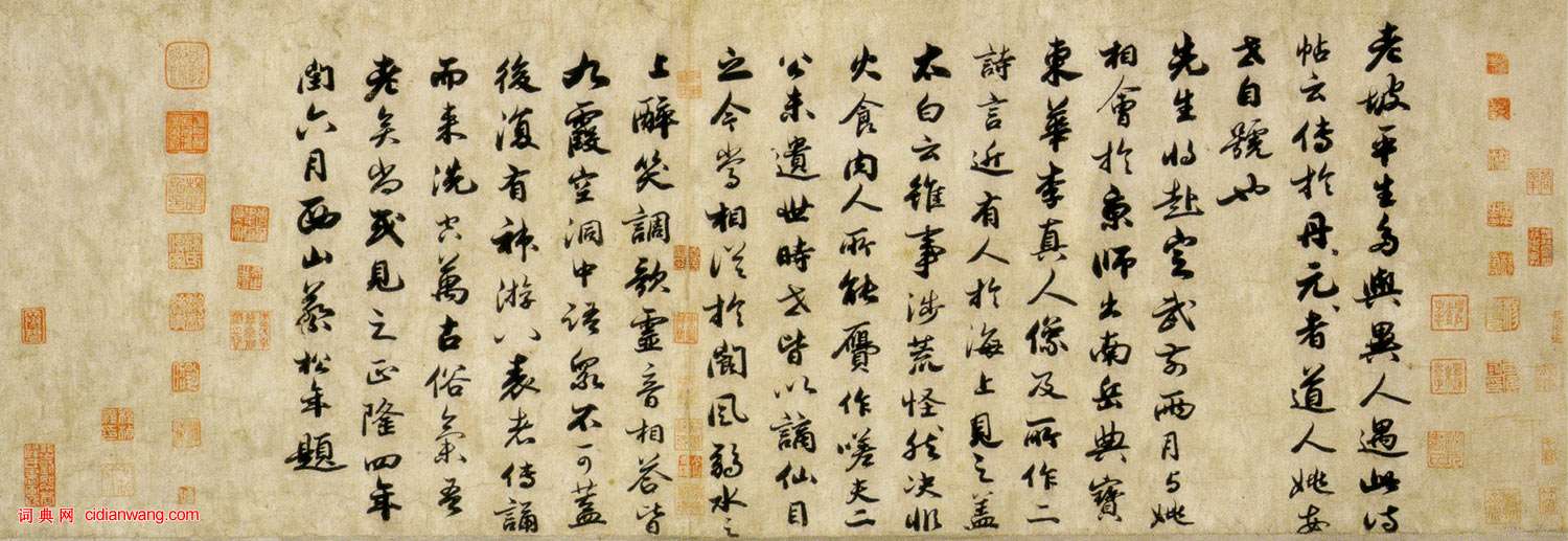 書法欣賞魏晉書法唐朝書法宋朝書法元朝書法明朝書法清朝書法近現代書法字典網>> 歷代書法>> 宋朝>> 蘇軾行書《李白仙詩卷》(4)正文 蘇軾行書《李白仙詩卷》(4)作者:蘇軾 書體:行書 附金人蔡松年的跋首 頁 上一頁 1 2 3 4 蘇軾的相關書法作品:蘇軾行書《滿庭芳詞》 蘇軾《覆盆子帖》 蘇軾《論書》原文與譯文(節錄) 蘇軾行書《令子帖》 蘇軾行書《次韻三舍人省上詩帖》 蘇軾行書《廷平郭君帖》 蘇軾《治平帖》 蘇軾行楷《祭黃幾道文卷》 蘇軾楷書《司馬溫公神道碑》 相關文章:沈曾植行書《臨法帖書屏》 (行書)沈曾植《臨法帖書屏》紙本 106.5×50.5cm×4 浙江省博物館藏 之三...王寵草書《致石壁尊兄書札》 (草書)王寵《致石壁尊兄書札》頁 台北故宮博物院藏 【釋文】違久馳慕。耿耿。承使者觸雨存...黃侃《篆書日守天留七言聯》 (篆書)黃侃《篆書日守天留七言聯》 136×34.6cm×2 1924年作 湖北省博...沈尹默行書《魯迅詩聯句》 (行書)沈尹默《行書魯迅詩聯句》紙本行書 上海市文史研究館藏 釋文:橫眉冷對千夫指,俯首...祁寯藻草書《臨十七帖軸》 (草書)祁寯藻《草書臨十七帖軸》紙本行書 102×37cm 山東省博物館藏釋文:諸從並...北魏《大方廣華嚴經》 (楷書)《大方廣華嚴經》是我國重要的大乘經典,有東晉佛陀跋陀羅所譯的六十卷本與武周實叉難...龍門二十品之太妃侯造像題記 (楷書)龍門二十品之《太妃侯造像題記》,全稱《廣川王祖母太妃侯造像題記》。景明四(503...蘇軾行書《歸園帖》 釋文 (行書)蘇軾《歸園帖》 北京故宮博物院藏 【歸園帖釋文】: 此確雲同歸院,亦不雲宿於院...吳大澂篆書《臨段敦(簋)》 (篆書)吳大澂《臨段敦(簋)》釋文:唯王十又四祀,十又一月丁卯,王真畢,烝。戊辰,曾(贈...譚延闓行書《勳勞議論七言聯》 (行書)譚延闓《勳勞議論七言聯》描畫蠟箋本行書 166.2×40.9cm×2 台北故...
