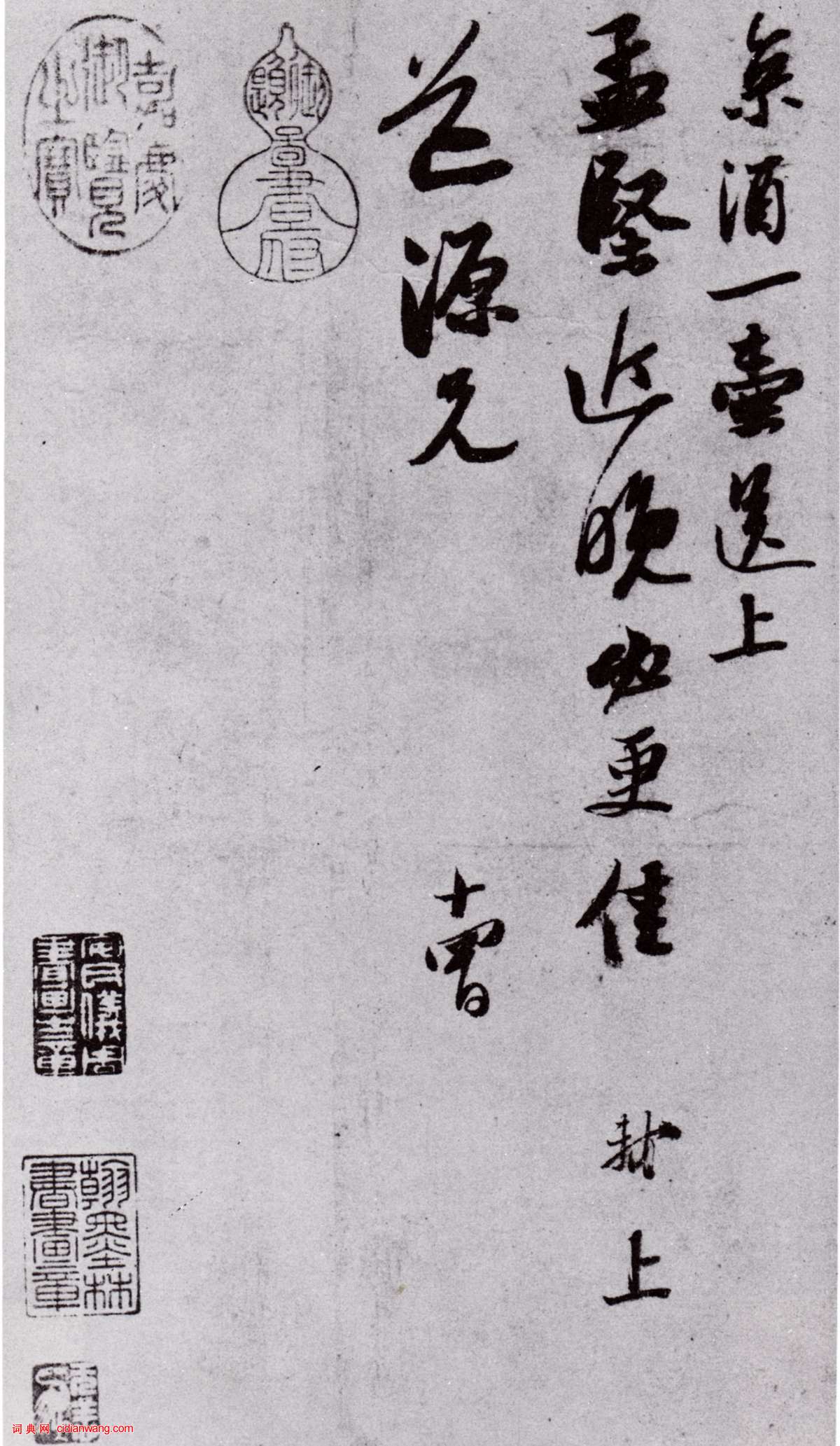 書法欣賞魏晉書法唐朝書法宋朝書法元朝書法明朝書法清朝書法近現代書法字典網>> 歷代書法>> 宋朝>> 蘇軾行書《京酒帖》正文 蘇軾行書《京酒帖》作者:蘇軾 書體:行書 蘇軾《京酒帖》 書於1080年(元豐三年) 行書釋文:京酒一壺送上 孟堅近晚 必更佳 軾上道源兄 十四日蘇軾的相關書法作品:蘇軾行書《北游帖》 蘇東坡《寒食帖》賞析 蘇軾·洞庭春色賦中山松醪賦合卷 蘇軾《天際烏雲帖》 蘇軾行書《滿庭芳詞》 蘇軾行書《廷平郭君帖》 蘇軾·羅池廟碑 蘇軾《人來得書帖》 蘇軾行書《陽羨帖》 相關文章:趙孟頫行書《紈扇賦》 (行書)趙孟頫行書作品欣賞《紈扇賦》(三希堂法帖刻本),書於大德九年(公元1305年)《...黃賓虹《篆書太史老農七言聯》 (篆書)黃賓虹《篆書太史老農七言聯》 選自《高山仰止·紀念黃賓虹誕辰150周年系列展...乾隆行書御臨《聖教序》 (行書)乾隆的書法學習趙孟頫,心慕手追,身體力行。遊覽名勝每到一處,作詩紀勝,御書刻石,...周天球行書《錄近作三首詩扇》 (行書)周天球《錄近作三首詩扇》行書 上海博物館藏【資料來源】轉自上海博物館藏明清書畫扇...“當代草聖”林散之談楷書林散之林散之,名霖,又名以霖,字散之,號三痴、左耳、江上老人等。生於南京市江浦縣...曾熙楷書《漢正衡石五言聯》 (楷書)曾熙《楷書漢正衡石五言聯》紙本楷書 169.2×36.8cm×2 1921年...吳熙載篆書《張華勵志詩四屏》軸 (篆書)吳熙載《張華勵志詩四屏》軸 紙本,118.2×37.5cm×4 日本東京國...謝萬行書《謝萬帖》 (行書)謝萬帖(選自大觀帖)釋文:七月十日萬告朗等:便流火感傷,兼切不自勝,柰何柰何!轉...虞世南《破邪論序》 (楷書)虞世南《破邪論序》三井藏本虞世南《破邪論序》安思遠藏本《破邪論序》虞世南小楷書,...顏真卿行草《劉中使帖》 (行草)顏真卿《劉中使帖》約書於大曆十年(775年)。墨跡。行書,信札。28.5×43...