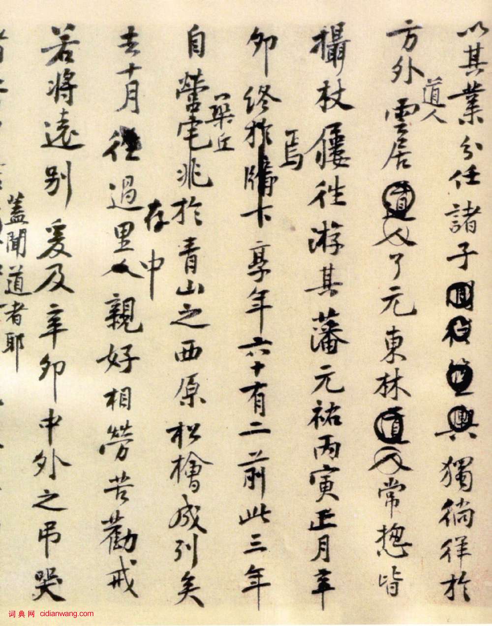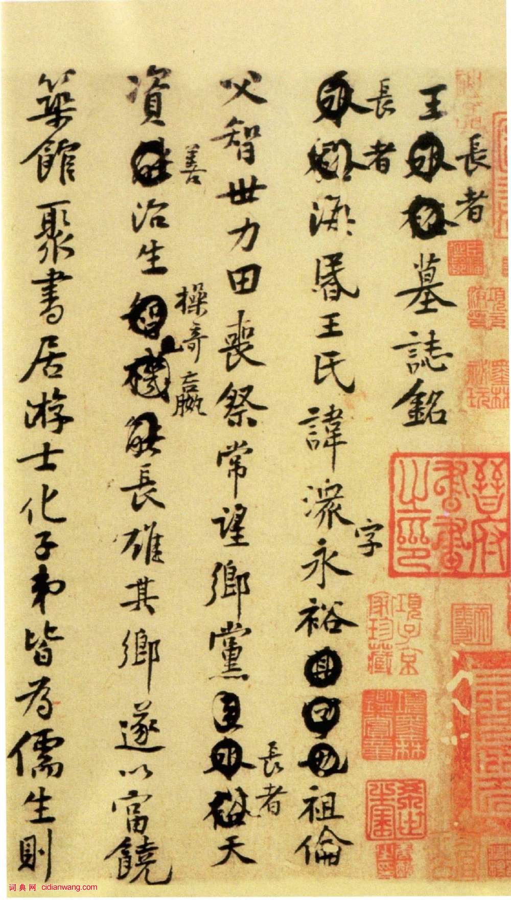 王長者墓志銘 長者海昏王氏諱潨,字永裕。祖倫,父智,世力田,喪祭常望鄉黨。長者天資善治生,操奇贏,長雄其鄉,遂以富饒。築館聚書,居游士化,子弟皆為儒生。則以其業分任諸子,獨徜徉於方外。道人云居了元、東林、常揔,皆攝杖屨往游其藩。元祐丙寅正月辛卯終焉,享年六十有二.前此三年自築丘於青山之西原,松檜成列矣。去十月過存里中親好,相勞苦勸戒,若將遠別。爰及辛卯,中外之吊哭者,皆曰君蓋聞道者耶!先配陳氏,繼室兩謝氏,七男子,楙、崇信、森、棣、權、彬、植,崇信前死。三女子,二婿曰董轂、高友諒,其季未媒也。楙等遂以其十月某甲子,奉窀穸如初志。楙娶李氏女,於庭堅母夫人為族兄弟,故楙因乞銘,太夫人曰:汝以外家故,不可辭銘。遂銘之。銘曰:以義力其窮,以智謝其豐,以理考其終,以文款其封。
