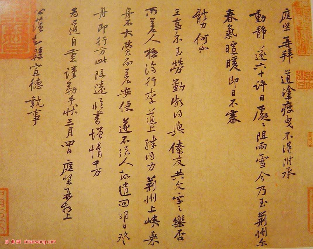 釋文:庭堅再拜,道塗疲曳,不得附承動靜。遂六十許日,處處阻雨雪,今乃至荊州爾。春氣暄暖 即日不審體力何如?王事不至勞勤,頗得與僚友共文字之樂否?所差人極濟,行李道上殊得力。荊州上峽,乘舟不大費而差安便。遂不須人,故遣回。明日登舟即行,方此阻遠,臨書增情,千萬為道自重。謹勒手狀,三月四日,庭堅再拜上。公蘊知縣宣德執事。