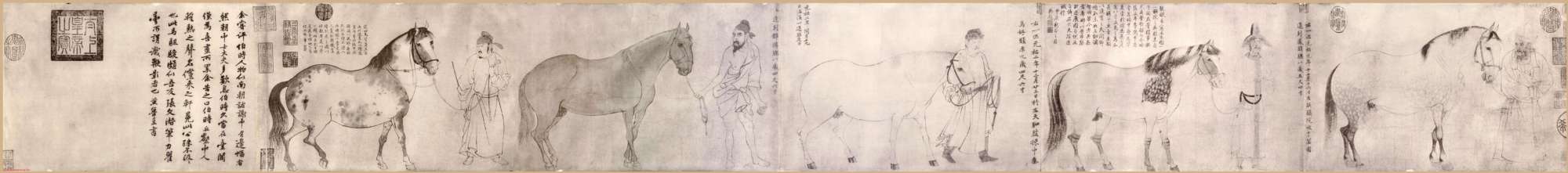 宋代傳世名作《五馬圖》,縱29.5厘米,橫225厘米,畫卷無名款,分五段,以白描的手法畫了五匹西域進貢給北宋朝廷的駿馬,各由一名奚官牽引。前四段均有黃庭堅的題記,謂馬之年齡、進貢時間、馬名、收於何廄等,後紙有黃庭堅跋語,跋稱為李伯時(公麟)所作。另有南宋初的曾紆跋,言及黃庭堅題於元祐五年(1090年)。該畫南宋時歸內府收藏,入元、明,經柯九思、張霆發諸家遞藏,康熙年間藏河南商丘宋犖家,乾隆時入清宮。是流傳有序的傳世名跡。乾隆皇帝兩次在《五馬圖》圖上題文,著錄於《石渠寶笈重編》。