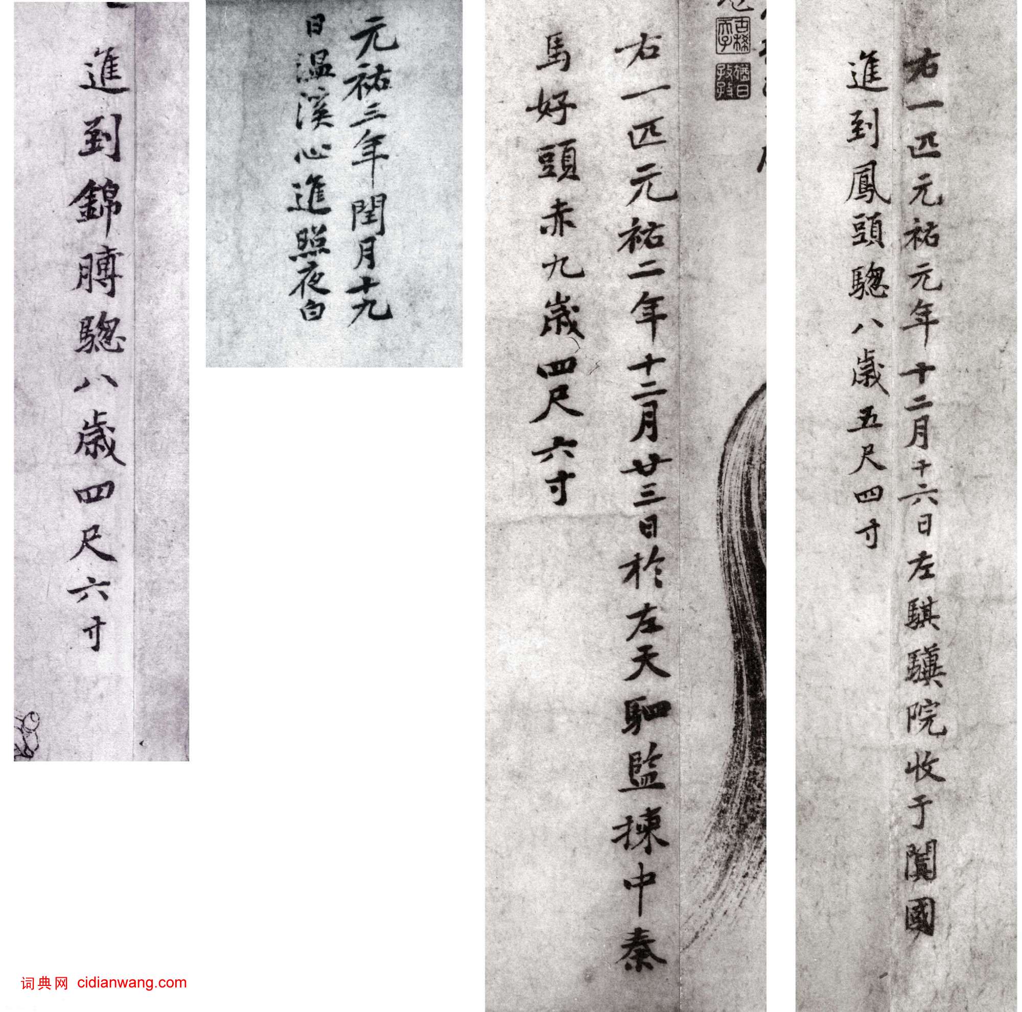 釋文: 右一匹,元祐元年十二月十六日左騏驥院收于闐國到進鳳頭驄,八歲,五尺四寸。