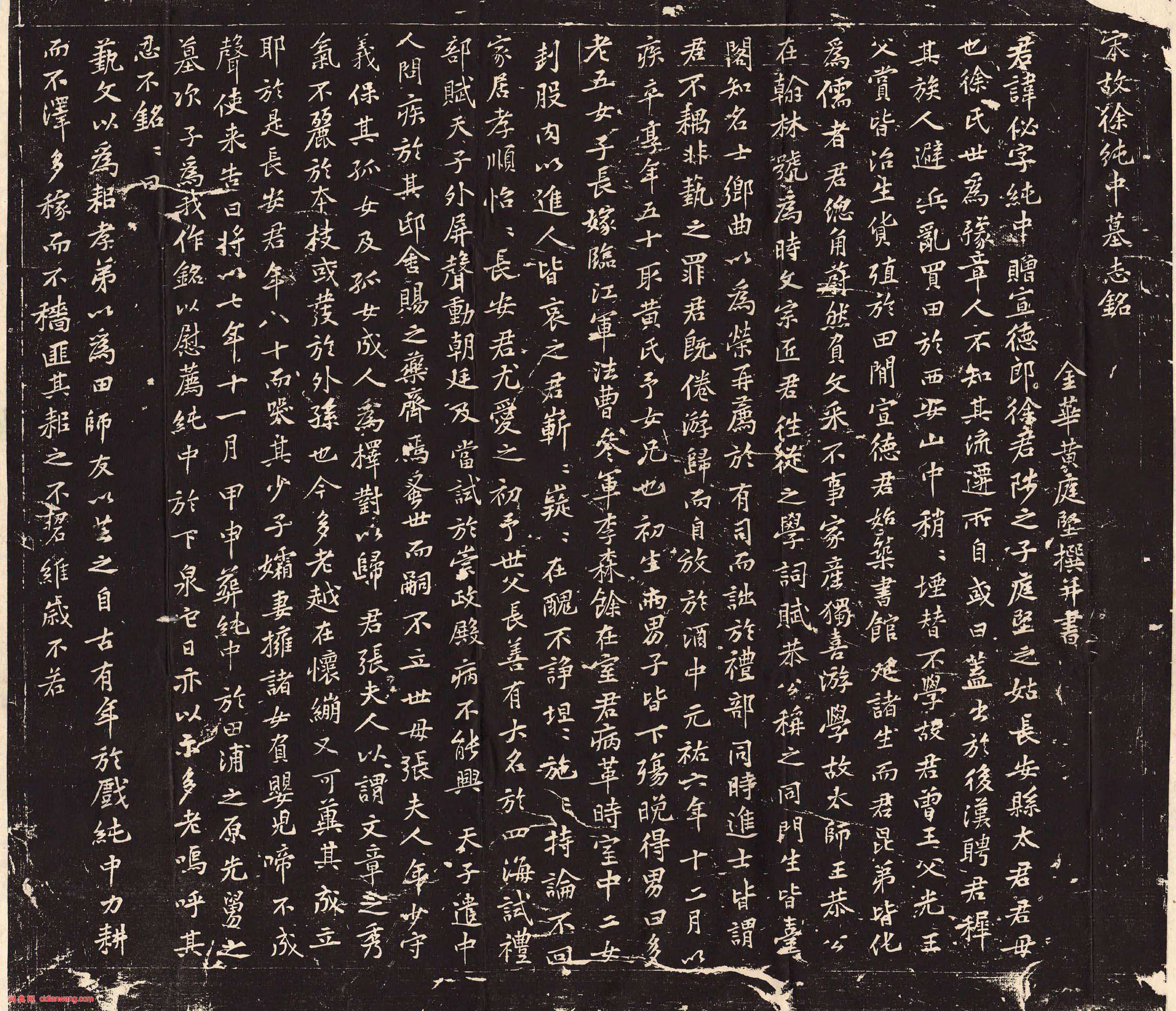 黃庭堅《徐純中墓志銘》行楷,72×63cm,24行,行25字,計548字。1988年出土於江西修水縣,現藏江西修水縣黃庭堅紀念館。