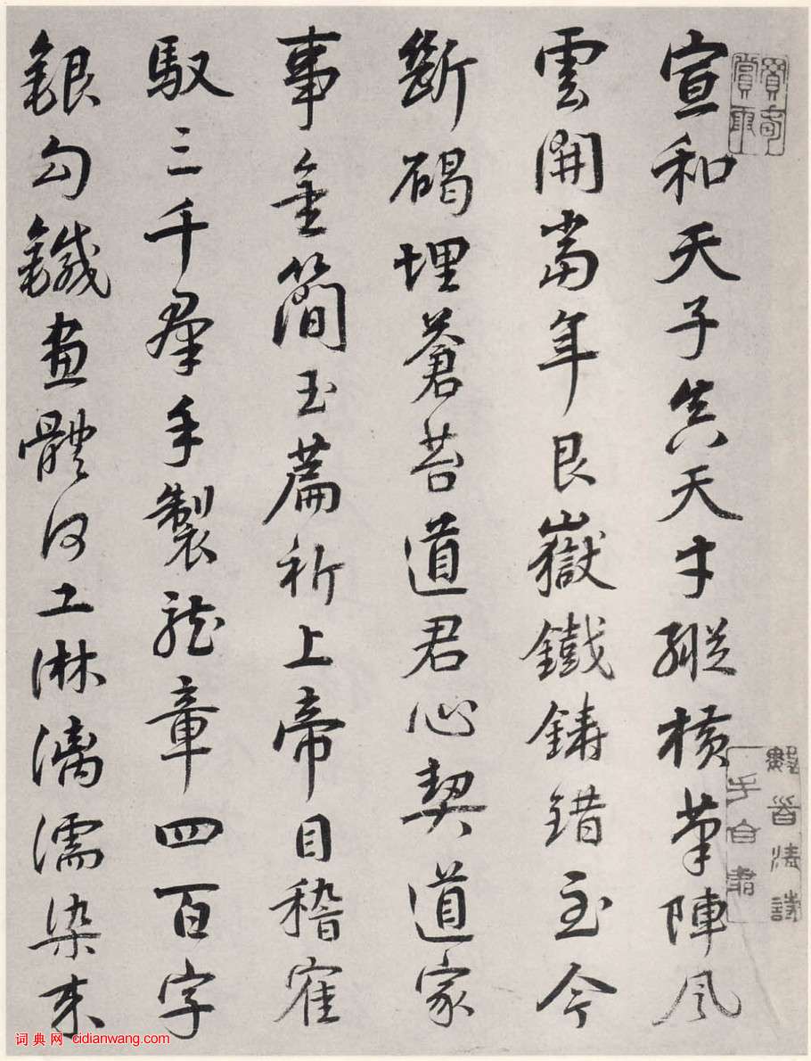 資源下載魏晉書法唐朝書法宋朝書法元朝書法明朝書法清朝書法近現代書法字典網>> 歷代書法>> 宋朝>> 趙佶楷書《神霄玉清萬壽宮詔》(11)正文 趙佶楷書《神霄玉清萬壽宮詔》(11)作者:趙佶 書體:楷書 首 頁 上一頁 4 5 6 7 8 9 10 11 12 13 下一頁 尾 頁趙佶的相關書法作品:趙佶·蔡行敕卷 趙佶楷書《夏日詩帖》 宋徽宗趙佶《題李白上陽台帖》 趙佶楷書《題錢文》 趙佶楷書《怪石詩帖》 宋徽宗趙佶題《唐十八學士圖卷》 趙佶楷書《祥龍石圖卷》題詩 趙佶楷書《神霄玉清萬壽宮詔》 趙佶草書《千字文》 相關文章:朱熹《大桂驛中帖》 (行草)【釋文】八月十五日熹頓首上啟。大桂驛中草草奉問想已達矣。行次宜春乃承專介惠書。獲...索靖·七月二十六日帖 (草書)【釋文】七月二十六日具書靖白:雖數相聞,不解勞倦,信至得書,悉知棄雲宅及計東來,...何紹基隸書《臨鄭固碑四條屏》 (隸書)何紹基《臨鄭固碑四條屏》紙本隸書 138.3×35cm×4 浙江省博物館藏釋...劉墉行書《節錄陸廷燦“續茶經”立軸》 (行書)劉墉《節錄陸廷燦“續茶經”立軸》行書 山東省博物館藏 釋文:竹泉在松滋縣南,苦...15種行書基本筆法,你會幾種?行書是在楷書基礎上發展演變出來的字型,因此在筆法上與楷書大體相同,只是起收、提按...錢大昕隸書《花開鍊句七言聯》 (隸書)錢大昕七言聯 : 173.5×39.1 cm×2 美國弗利爾美術館藏釋文:花...唐寅行書《尺牘之一》 (行書)唐寅《尺牘之一》紙本行書 22.6×26.5cm 台北故宮博物院藏 釋文:侍生...宋徽宗趙佶題《唐十八學士圖卷》 (楷書)宋徽宗題《唐十八學士圖卷》,瘦金體,絹本 本幅29.4×519cm 台北故宮博...傅山《草書孟浩然詩卷》 (草書)傅山草書孟浩然詩卷,紙本長卷,草書。縱28.2厘米,橫294.8厘米。此作今藏北...文徵明大字行書《梅花詩》 (行書)明代文徵明83歲大字行書賞析《梅花詩》卷,縱47.2厘米,橫470厘米,款署“壬...