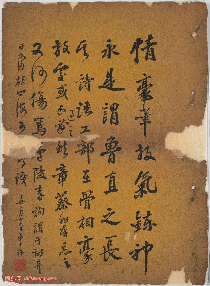 資源下載魏晉書法唐朝書法宋朝書法元朝書法明朝書法清朝書法近現代書法字典網>> 歷代書法>> 宋朝>> 黃庭堅草書《蘇軾赤壁懷古》(8)正文 黃庭堅草書《蘇軾赤壁懷古》(8)作者:黃庭堅 書體:草書 赤壁懷古.蘇軾詞.黃庭堅草書赤壁懷古.蘇軾詞.黃庭堅草書赤壁懷古.蘇軾詞.黃庭堅草書首 頁 上一頁 1 2 3 4 5 6 7 8黃庭堅的相關書法作品:黃庭堅行書《奉呈外舅孫莘老》 黃庭堅行書《松風閣詩帖》 黃庭堅草書《花氣薰人帖》 黃庭堅行書《雪寒帖》 黃庭堅行書《李公麟五馬圖題記跋語》 黃庭堅草書《劉禹錫竹枝詞卷》 黃庭堅《致景道十七使君尺牘》 黃庭堅小楷《跋范仲淹“道服贊”》 黃庭堅《李白憶舊遊詩草書卷》 相關文章:王鐸草書《題野鶴陸舫齋》 (草書)明代王鐸草書《題野鶴陸舫齋》自署書於清順治七年(1650)。紙本。自作詩五律十首...吳雯《行書送徐道沖之粵東五言詩軸》 (行書)吳雯《行書送徐道沖之粵東五言詩軸》紙本行書 140×41cm 山西省博物院藏 ...趙孟頫《趵突泉詩》 (行書)趙孟頫《趵突泉詩》,紙本,行書,縱33.1cm,橫83.3cm。台北故宮博物院藏...林散之《贈桑作楷草書脫俗寫生七言聯》 (草書)林散之《贈桑作楷草書脫俗寫生七言聯》紙本草書 135×35cm×2 1976...王寵《行書西苑詩》卷 (行書)王寵《行書西苑詩》卷 紙本 行書 25×235cm 天津博物館藏釋文:西苑詩,...李建中·同年帖 (行書)【釋文】金部同年,載喜披風,甚慰私抱,殊為款曲。旋值睽離,必然來晨朝車行邁,適蒙...吳玉如《篆書條幅》 (篆書)吳玉如《篆書條幅》 1942年作 釋文:神清洞中流水潺潺界以青松朱扉惟忠孝列仙居...弘一法師(李叔同)《晉譯大方廣佛華嚴經》選聯 (楷書)李叔同(1880—1942),又名李息霜、李岸、李良,譜名文濤,幼名成蹊,學名廣...顏真卿楷書《多寶塔碑》 (楷書)顏真卿《多寶塔碑》,全稱《大唐西京千福寺多寶塔感應碑》,天寶十一年(752)四月...魯迅《行書悼楊銓詩》 (行書)魯迅《行書悼楊銓詩》24.2×27.3cm 1933年 北京魯迅博物館藏釋文:...