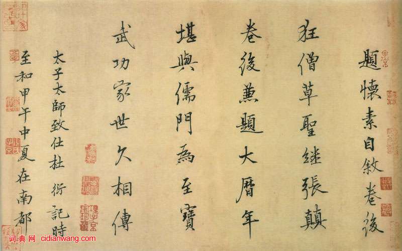 書法欣賞魏晉書法唐朝書法宋朝書法元朝書法明朝書法清朝書法近現代書法字典網>> 歷代書法>> 宋朝>> 杜衍行楷《題懷素自敘帖後》正文 杜衍行楷《題懷素自敘帖後》作者:杜衍 書體:行楷 杜衍《題懷素自敘帖後》,行楷書。現藏台北故宮博物院。 釋文:狂僧草聖繼張顛,卷後兼題大曆年。堪與儒門為到寶,武功家世久相傳。蘇軾評杜衍云:“正獻公晚乃學草書,遂乃一代之絕,清閒妙麗,得晉人風氣。”1 2 下一頁 尾 頁 全文杜衍的相關書法作品:杜衍行楷《題懷素自敘帖後》 杜衍草書《仲冬嚴寒帖》 相關文章:張即之行楷《金剛般若波羅蜜經》 (行楷)張即之《金剛般若波羅蜜經》 紙本 行楷 縱32.3厘米 日本京都智積院藏《金剛般...盧中南硬筆楷書《臨歐陽詢皇甫誕碑》 (楷書)皇甫誕碑全稱《 隋柱國左光祿大夫弘義明公皇甫府君之碑 》,亦稱《 皇甫君碑 》,...董小宛《小楷秋閨詞自作七言詩十一首扇面》 (小楷)董小宛《小楷秋閨詞自作七言詩十一首扇面》金箋紙楷書 18.5×51.4cm 吉...孟繁禧行書《心經》 (行書)孟繁禧,1954年出生於北京,祖籍山東,自幼潛心學習書法,受教於康雍先生,尤擅歐...吳興祚《行書七絕詩軸》 (行書)吳興祚《行書七絕詩軸》 台北何創時書法藝術館藏 釋文:畫道分明畫裡來,參差亭榭小...鄧石如行草《海龍天鶴五言聯》 (行草)鄧石如《海為龍世界 天是鶴家鄉行草五言聯》 中國國家博物館藏【釋文】海為龍世界,...文徵明狂草詩卷 (草書)草書詩卷 紙本 縱26公分 橫487公分 上海博物館藏 文徵明狂草,世不多見。這...申時行草書《七律詩扇》 (草書)申時行《草書七律詩扇》 金箋草書 15.2×48.5cm 北京故宮博物院藏釋文...陳鴻壽《行書蔡襄精茶帖軸》 (行書)陳鴻壽《行書蔡襄精茶帖軸》紙本行書 104.3×28cm 雲南省博物館藏釋...米芾行楷《王略帖贊》 (行楷)米芾王略帖贊 (《破羌帖跋贊》) 行楷書 縱22.9厘米 橫48.2厘米 北京故...