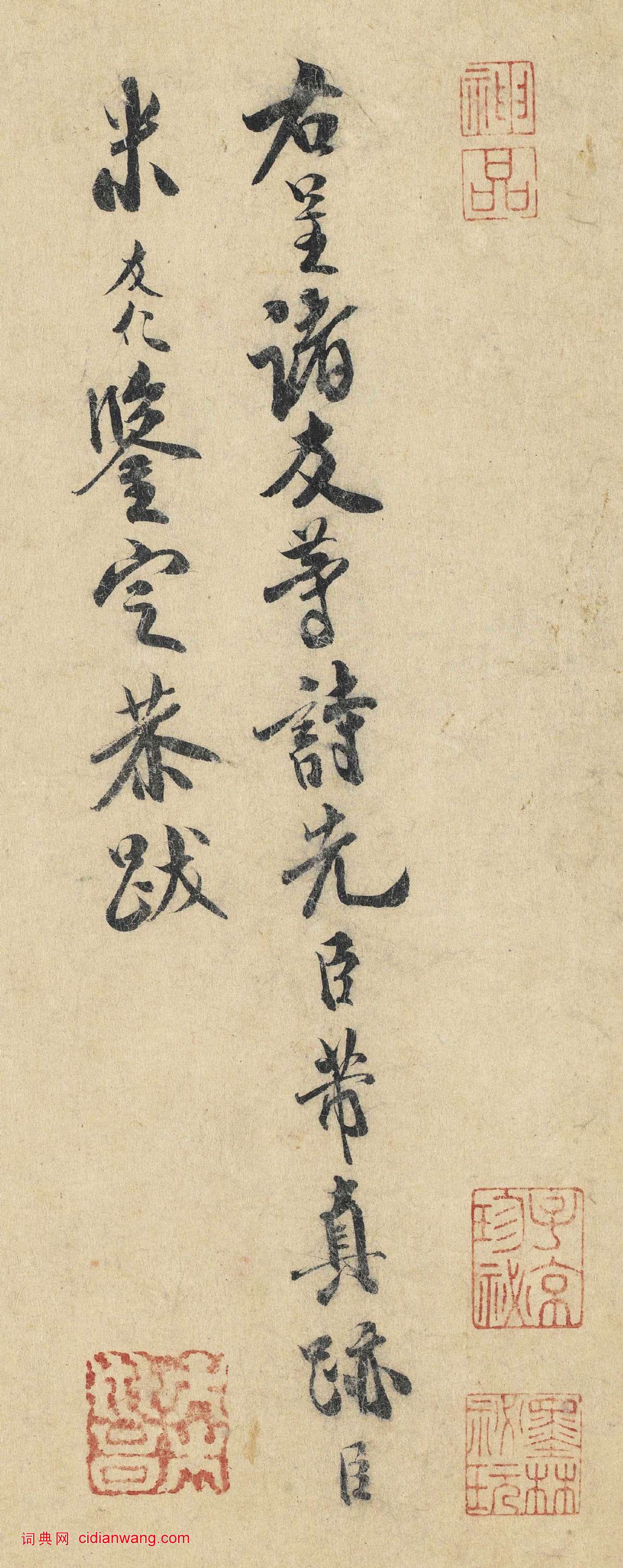 書法欣賞魏晉書法唐朝書法宋朝書法元朝書法明朝書法清朝書法近現代書法字典網>> 歷代書法>> 宋朝>> 米友仁行書《跋米芾苕溪詩卷 》正文 米友仁行書《跋米芾苕溪詩卷 》作者:米友仁 書體:行書 米芾《苕溪詩》卷末有米芾長子米友仁跋,北京故宮博物院藏。釋文:右呈諸友等詩,先臣芾真足跡,臣米友仁鑑定恭跋。2017-11-3 18:08:57 米友仁的相關書法作品:米友仁行書《跋米芾苕溪詩卷 》 米友仁·題《遠岫晴雲圖》 米友仁《動止持福帖》 米友仁《瀟湘奇觀圖題跋》 米友仁《跋隋人出師頌》 米友仁《文字帖》 米友仁《跋研山銘》 相關文章:文徵明《行書致妻札》 (行書)文徵明《行書致妻札》 右25.5×12.3cm 左25.5×10.3cm 上...馬愈《暑氣帖》 (行書)【釋文】暑氣初平,頗有涼思。十一日敬潔一觴,敢請移玉過寒舍話舊片時,惟不外是荷。...陳基《賢郎帖》 (行草)元 陳基 《賢郎帖》 紙本,北京故宮博物院藏。 陳基(1314—1370年),字...丁敬隸書《五律詩軸》 (隸書)丁敬《隸書五律詩軸》紙本隸書 北京故宮博物院藏 釋文:遠塔見亭亭,晴光...唐玄宗李隆基行書《鶺鴒頌》 (行書)唐玄宗李隆基《鶺鴒頌》,疑雙鉤本,或出自宮廷書手。紙本。縱26厘米,橫192厘米...沙孟海《隸書文章風月五言聯》 (隸書)沙孟海《隸書文章風月五言聯》 133.3×25.5cm×2 ...蘇軾行書《春中帖》 (行書)蘇軾行書《春中帖》 紙本,縱28.2cm 橫43.1cm 故宮博物院藏。此帖是蘇...龍門二十品《元祐造像記》 (楷書)元祐造像記拓片 《元祐造像記》,全稱《齊郡王元祐造像記》。熙平二(517)年七月...乙瑛碑 (隸書)全稱《漢魯相乙瑛請置孔廟百石卒史碑》,又稱《孔廟置守廟百石卒史碑》、《孔龢碑》。...梁昇卿隸書《御史台精舍碑》 (隸書)梁昇卿生卒不詳,初仕奉天縣尉,後官至廣州都督,太子右庶子,約天寶初年卒。與張九齡...