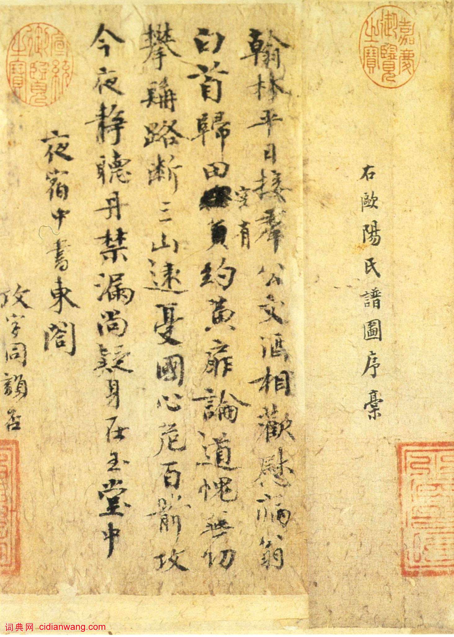 歐陽修《譜圖序稿》,實際上包括《歐陽氏譜圖序》和《夜宿中書東閤》七律一首。從跋文中可知前者作於至和二年(1055),作者時年四十九歲,後者作於嘉祐八年(1063),時年五十七歲。