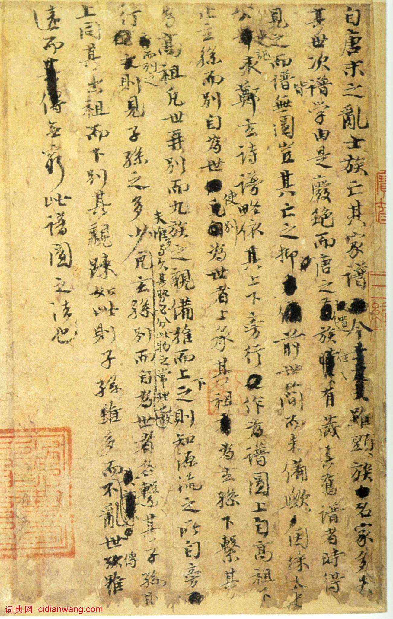 自唐末之亂,士族亡其家譜,今雖顯族名家多失其世次,譜學由是廢絕。而唐之遺族往往有藏其舊譜者時得見之,而譜皆無圖。豈其亡之?抑前世簡而未備歟?因採太史公史記表鄭玄詩譜。略依其上下,旁行作為譜圖。上白高祖,下止玄孫,而別自為世。使別為世者上承其祖,為玄孫下系其□。為高祖凡世再別,而九族之親備。推而上下之,則知源流之所自;旁行而列之,則見子孫之多少。夫惟多與久,其勢必分,此物之常理也。故凡玄孫別而自為世者,名系其子孫,則上同其出祖,而下別其親疏。如此則子孫雖多而不亂,世傳雖遠而無窮。此譜圖之法也。